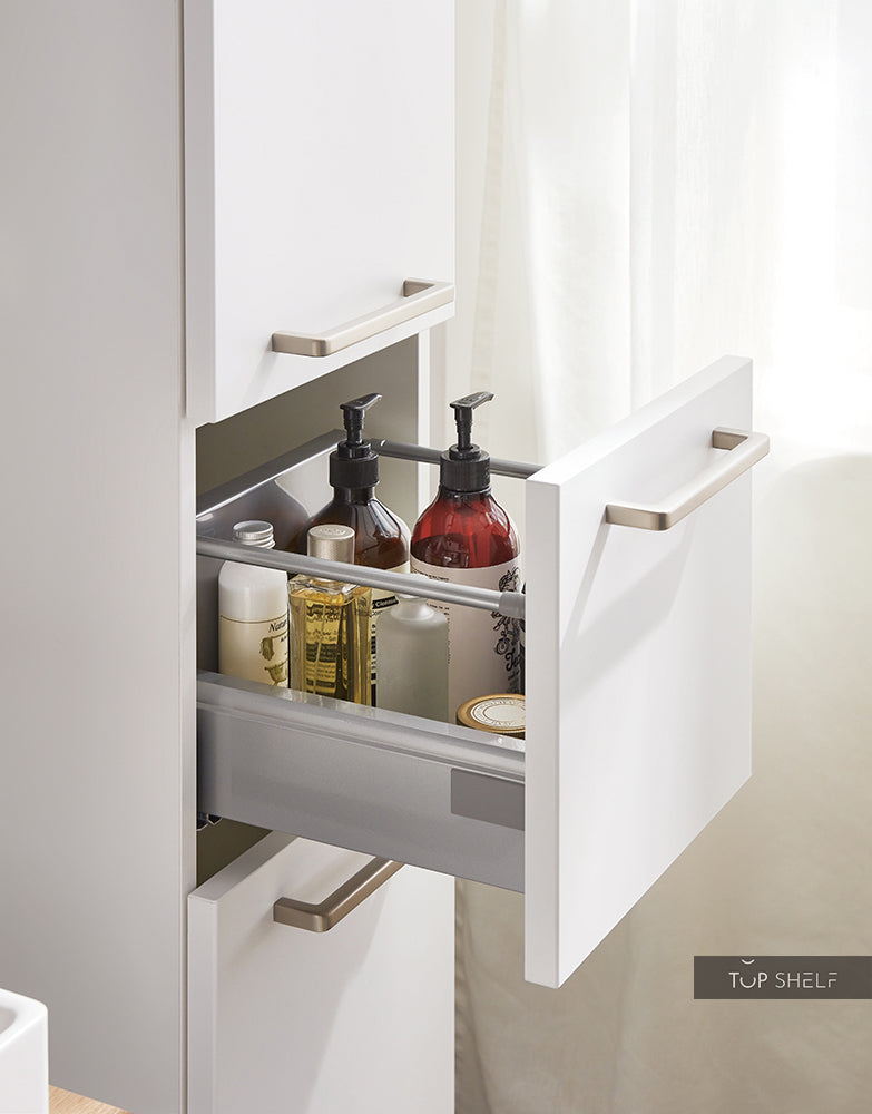 Eine Abdeckplatte ist eine durchgängige Platte die oben auf dem Schrank montiert wird. Sie überdeckt die obere Kante von Türen und Schubladen da sie vorne und an den Seiten leicht übersteht. So erhält der Schrank auf der Oberseite einen schönen Abschluss. Wenn Sie wie bei dem Badmöbel Set „Bad Pyrmont“ mehrere Möbelstücke auf gleicher Höhe platzieren, schafft eine Abdeckplatte einen nahtlosen Übergang, sodass die gesamte Optik der Schrankwand schlichter und klarer wird.