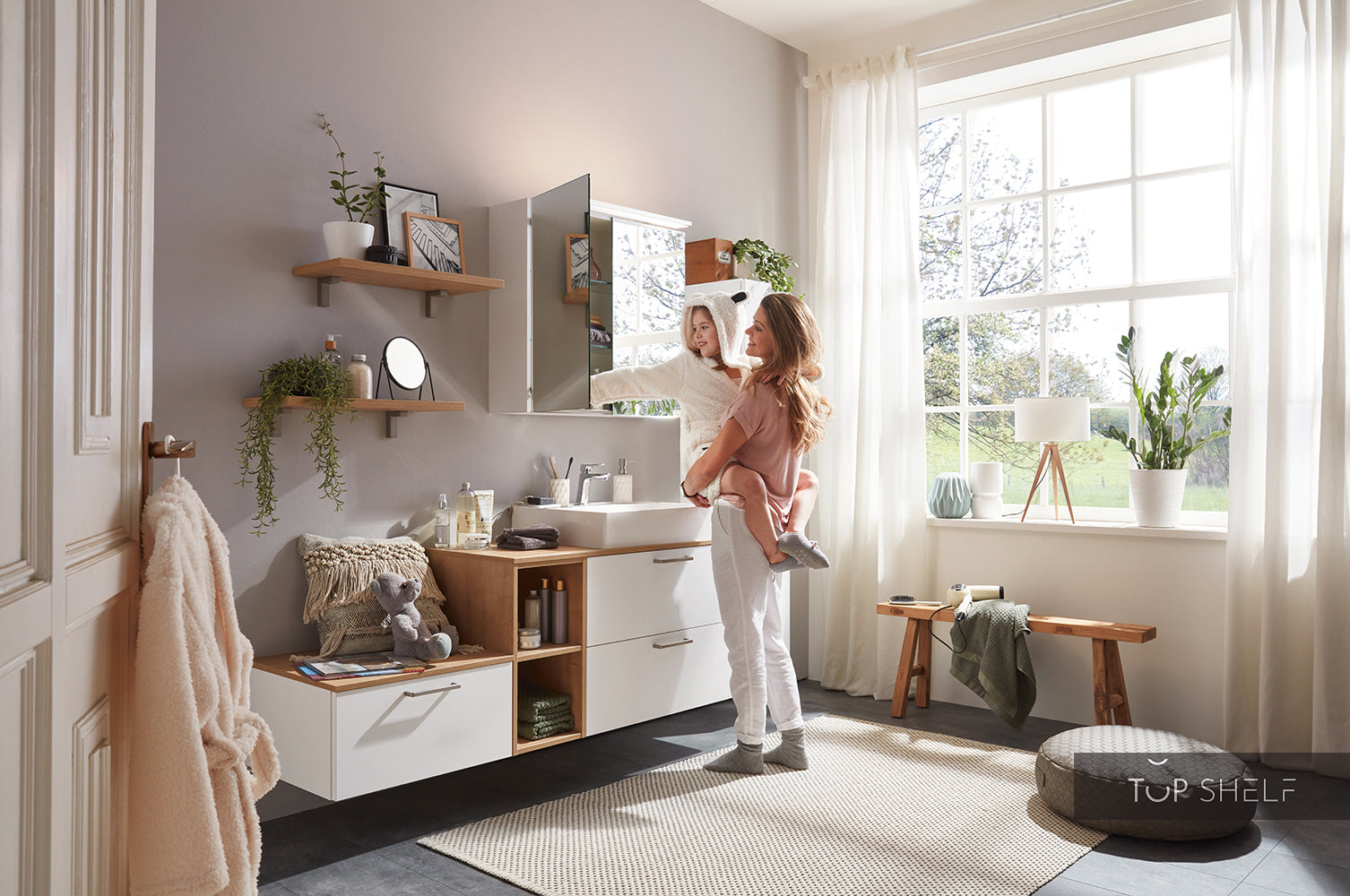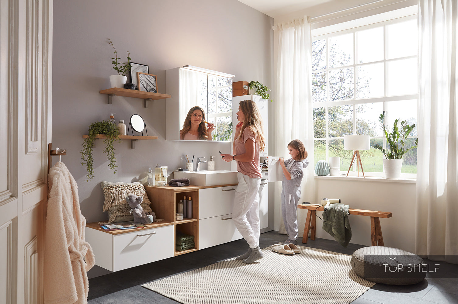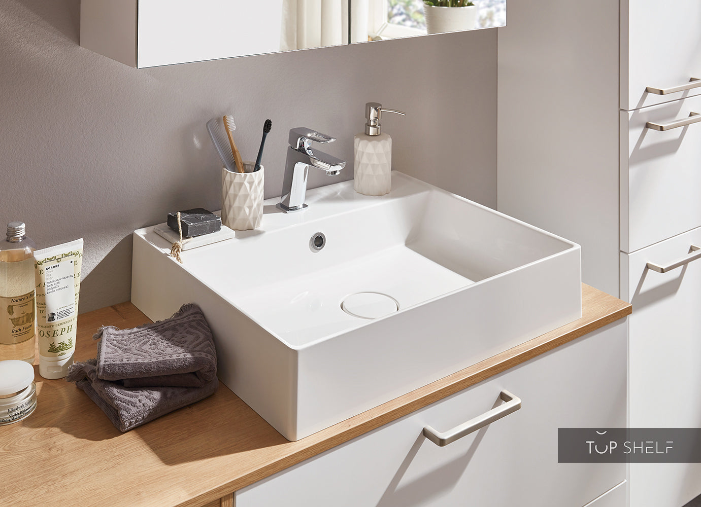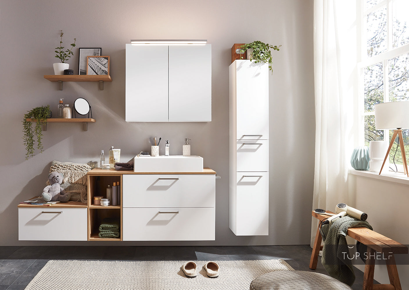 Darüber hinaus beinhaltet das Bad Set einen Abfallsammler, einen Handtuchhalter, eine Armatur und eine LED-Aufsatzleuchte für den Spiegelschrank inkl. Emotion Funkbedienung.