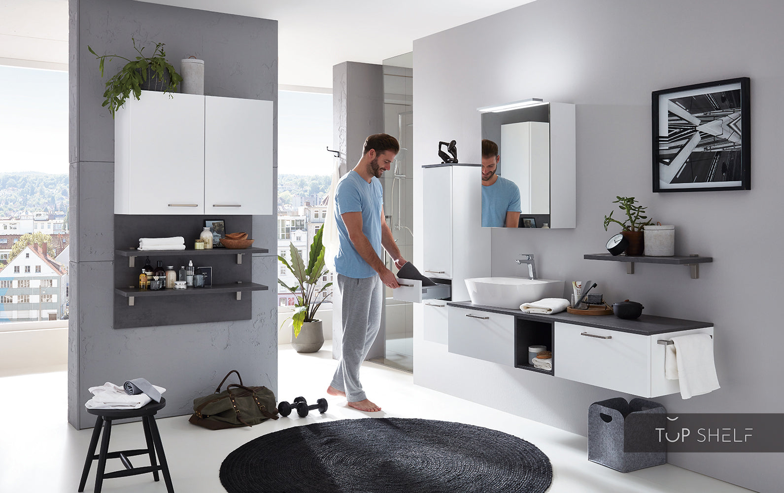 Kategorie: 180cm, 192 Eiche Provence, 193 Alpinweiß, 2-Mann-Handling, 332 Touch Alpinweiß supermatt, 354 Beton Schiefergrau, Bad, Badezimmer, Badmöbel Set, H-115cm, nobilia, Palettenversand, Sofort Verfügbar, weiß