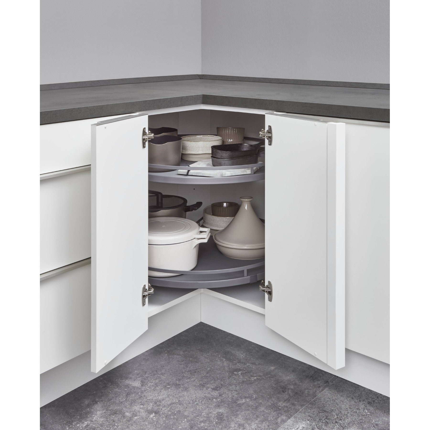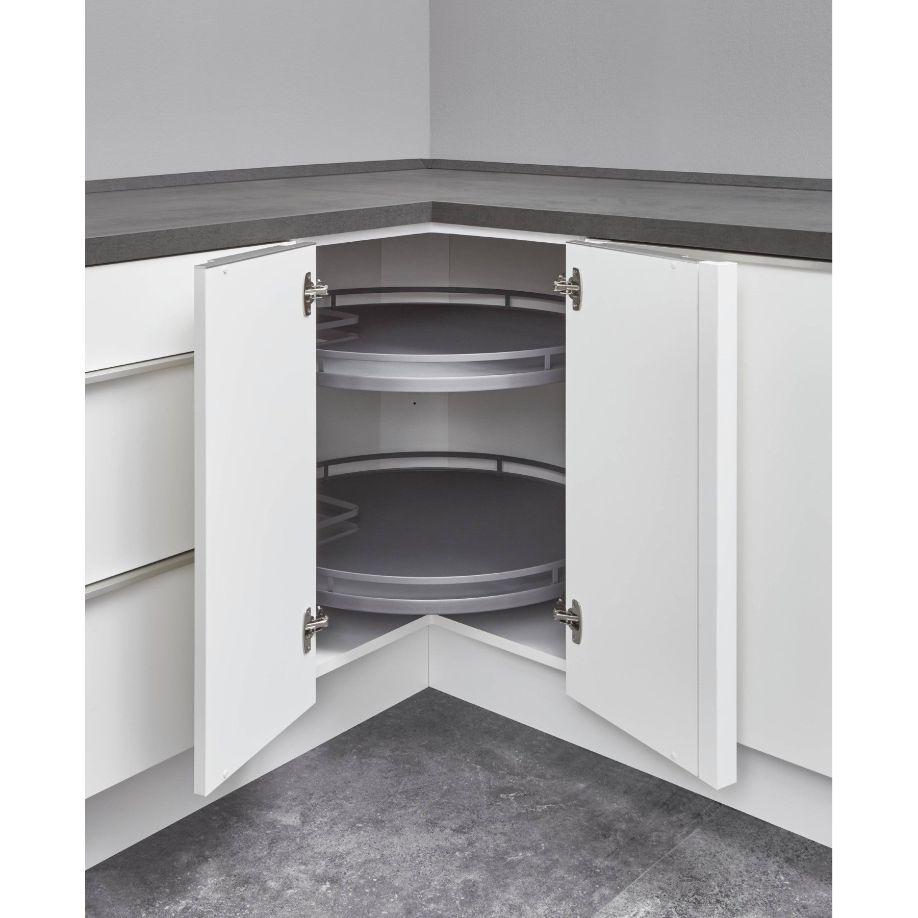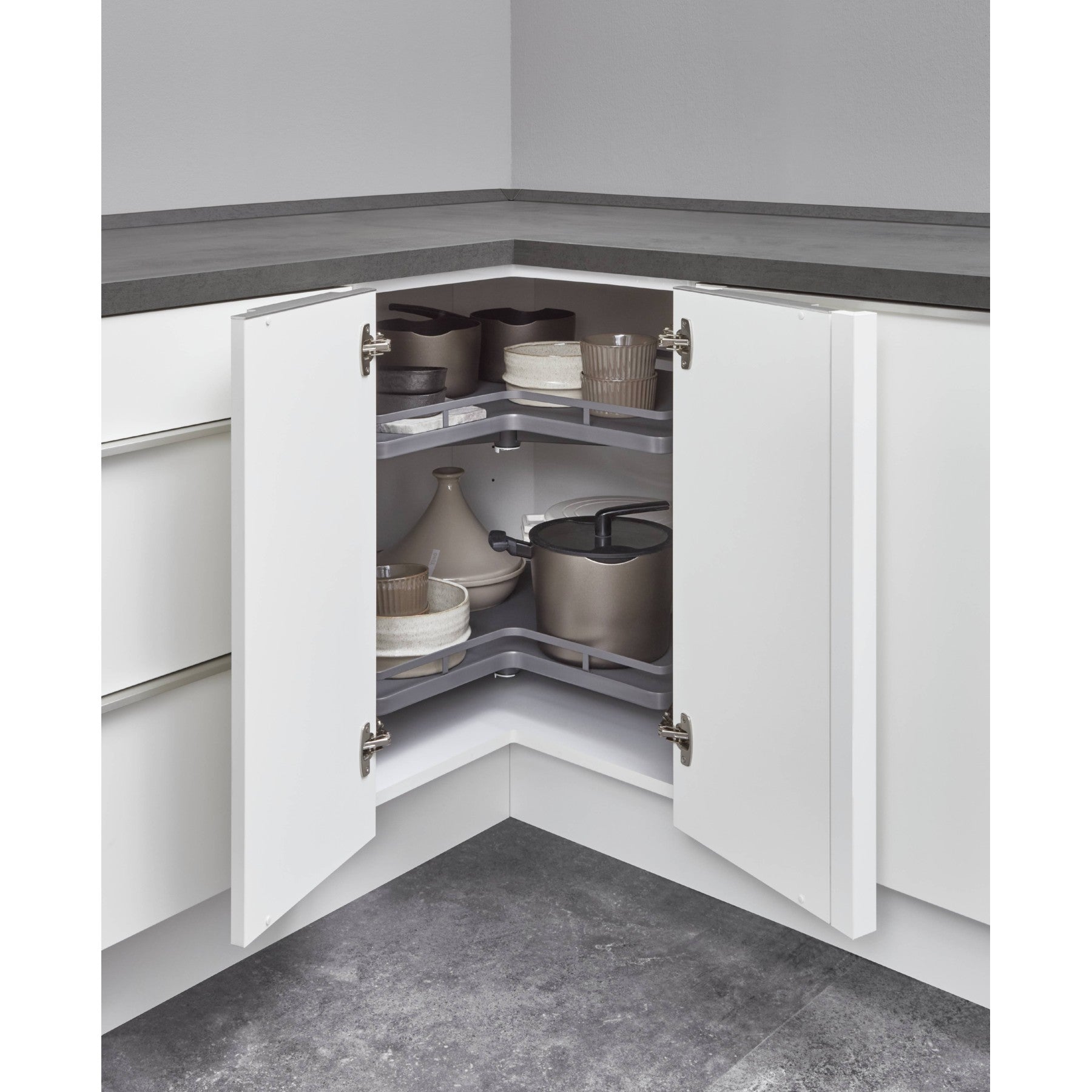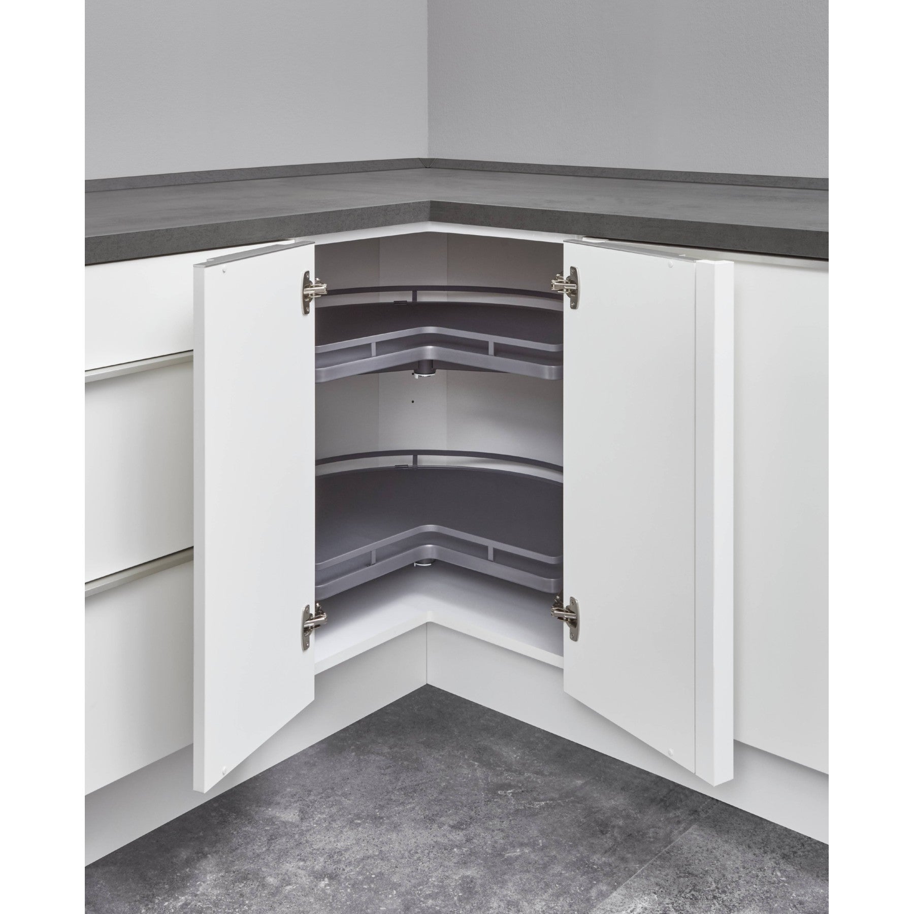 Dieser Eckschrank zeichnet sich durch seine zwei durchgehenden Türen aus, die mit einem Öffnungswinkel von beeindruckenden 165° einen komfortablen Zugang zu all Ihren Küchenutensilien ermöglichen. Die Türen sind so konzipiert, dass sie harmonisch in jede Küchengestaltung integrieren, ohne dabei aufdringlich zu wirken. Der Griff ist geschickt auf der linken Tür positioniert, was die Handhabung erleichtert und zur ästhetischen Ausstrahlung des Schranks beiträgt.