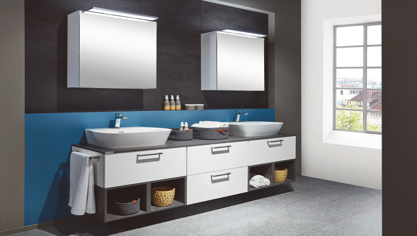 Mirror cabinets above the washbasin cleverly combine the mirror with a storage area that is particularly suitable for cosmetics, deodorant or other everyday products. Combined with a cover plate and lighting from the nobilia elements accessories, this practical cabinet also becomes a real eye-catcher!