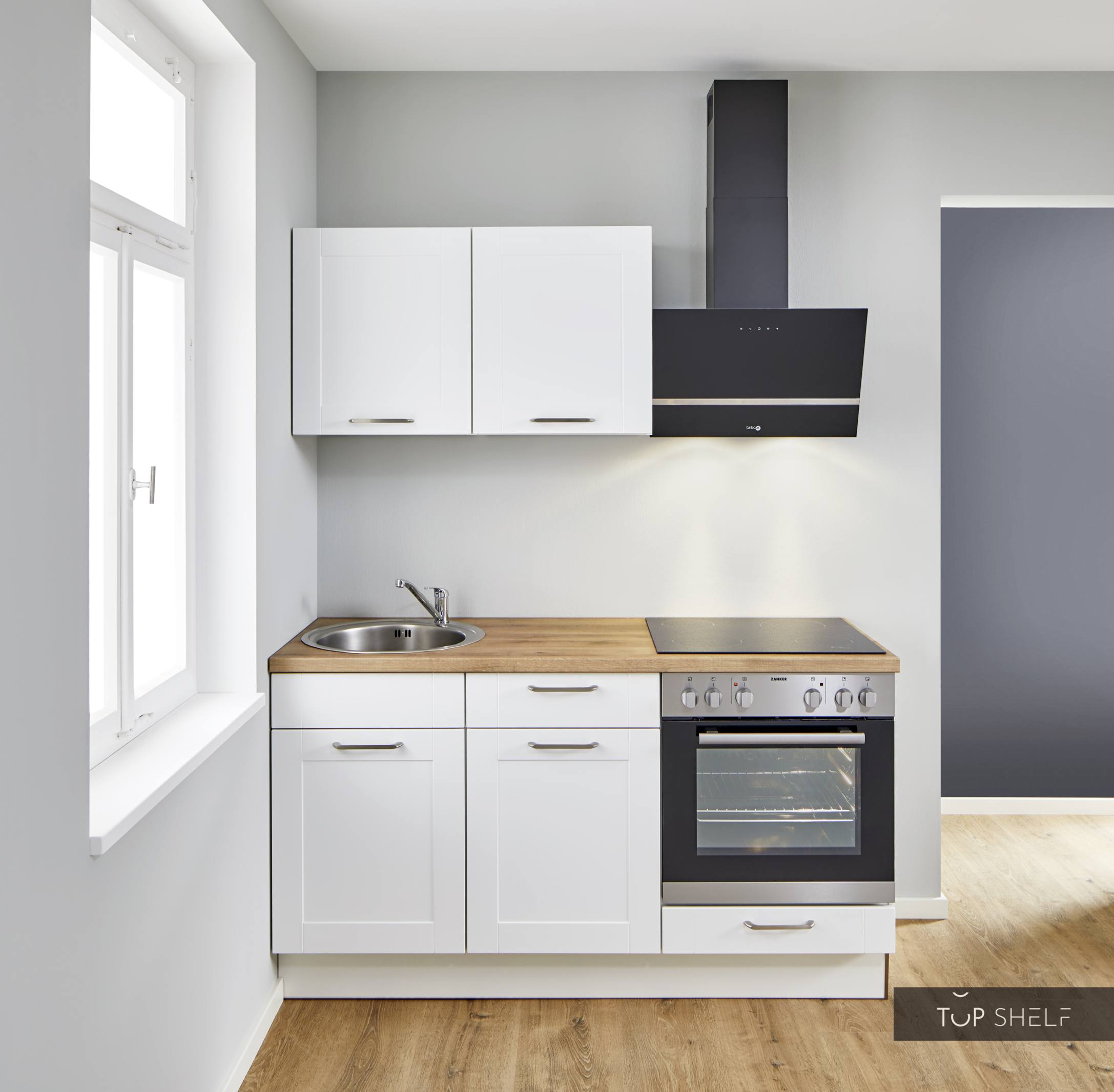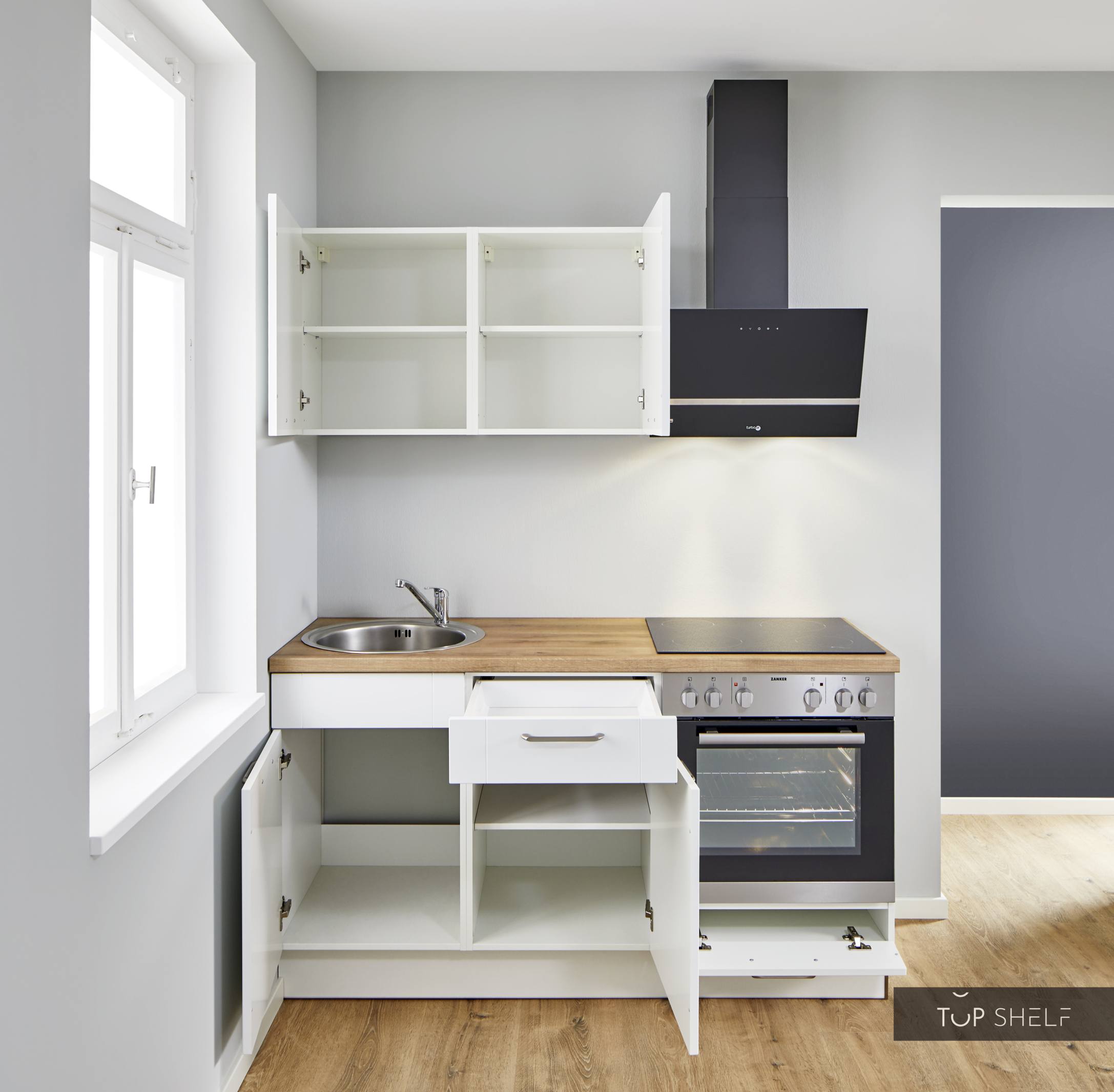 The fully pre-assembled Pino kitchen consists of a kitchen unit with a total length of 1.60 m | 160 cm. The fitted kitchen includes a sink cabinet, a built-in oven cabinet, a base cabinet, and two wall cabinets. The matching built-in appliances are delivered directly with the kitchens.