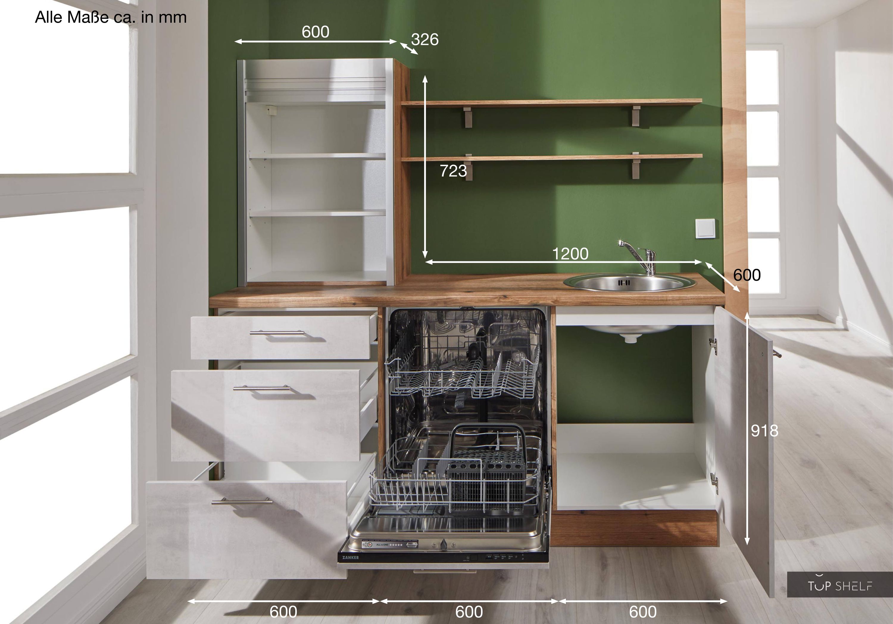 The fully pre-assembled Pino kitchen consists of a kitchen unit with a total length of 1.80 m | 180 cm. The fitted kitchen includes a sink cabinet, a base cabinet, a top cabinet, two wall shelves, and a dishwasher front with door front for fully integrated dishwasher. The kitchens are delivered directly with the matching built-in appliances from the manufacturer Zanker.