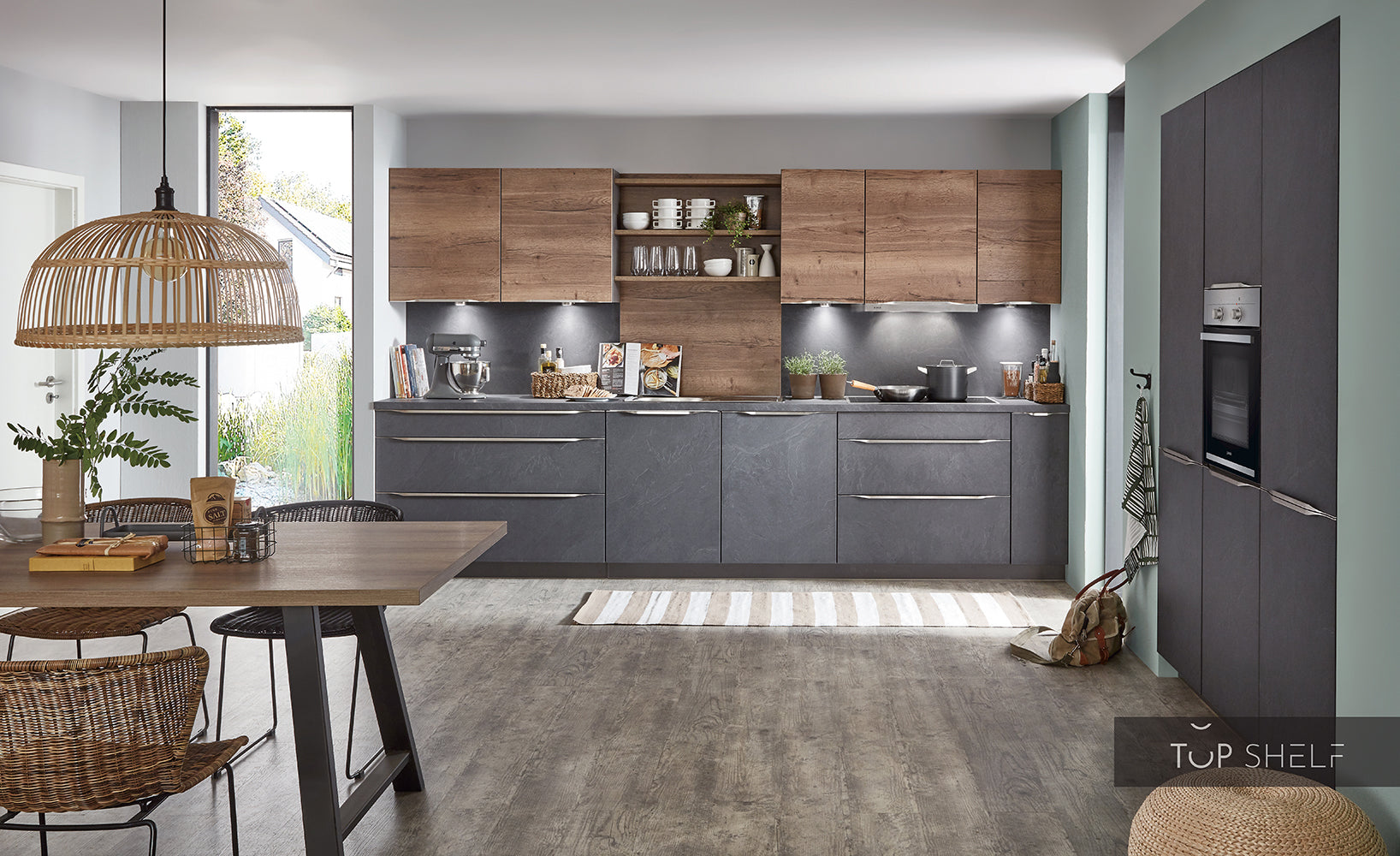 With our innovative online kitchen planner, you can plan an immediately available nobilia kitchen made of high-quality nobilia kitchen cabinets and optional electrical appliances. The TOP-SHELF.de 3D online kitchen planner is very fast, easy to use, completely free of charge and immediately shows you our transparent prices!