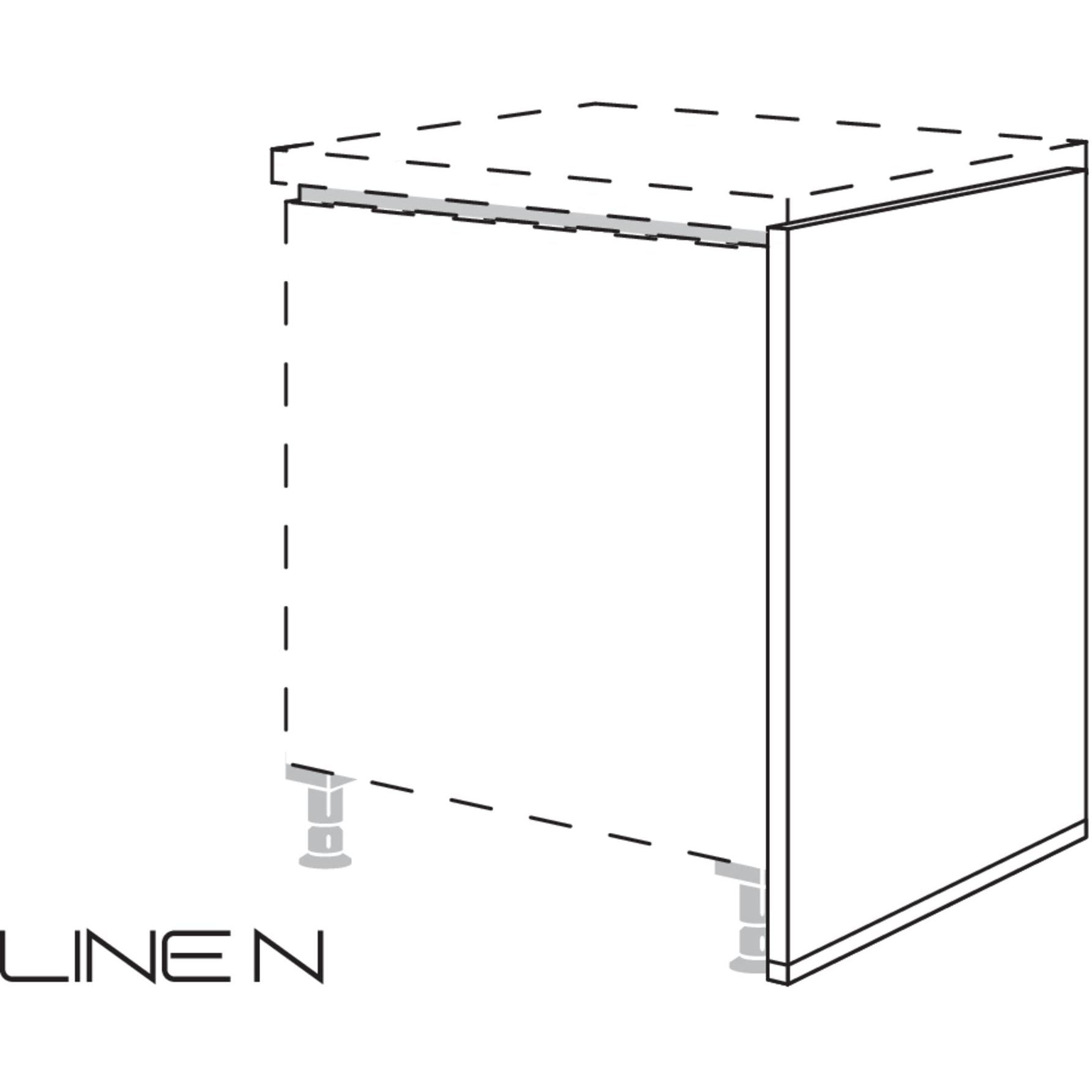 The LINE N end panel is particularly suitable for designs with a worktop depth of 600 mm. Depending on the chosen plinth height, the total height of the end panel varies. With a plinth height of 70 mm, the total height is 790 mm, with 100 mm plinth height 820 mm, with 150 mm plinth height 870 mm, and with 200 mm plinth height 920 mm.