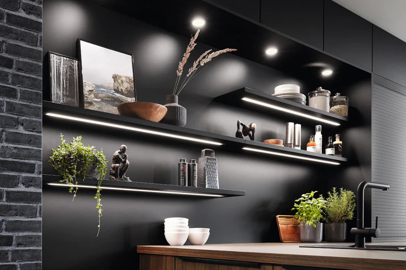 Nobilia side panel systems are available in around 100 decors and in widths of 10 mm, 16 mm, 25 mm and 50 mm. The range of types that can be delivered depends on the material thickness: side panels, shelves, top shelves, base and cornice shelves. The exact side panel height supplied is the result of the body height plus the base height, minus 8 mm for the side panel. The cheek shoe is available in 010 black and 014 stainless steel look.
