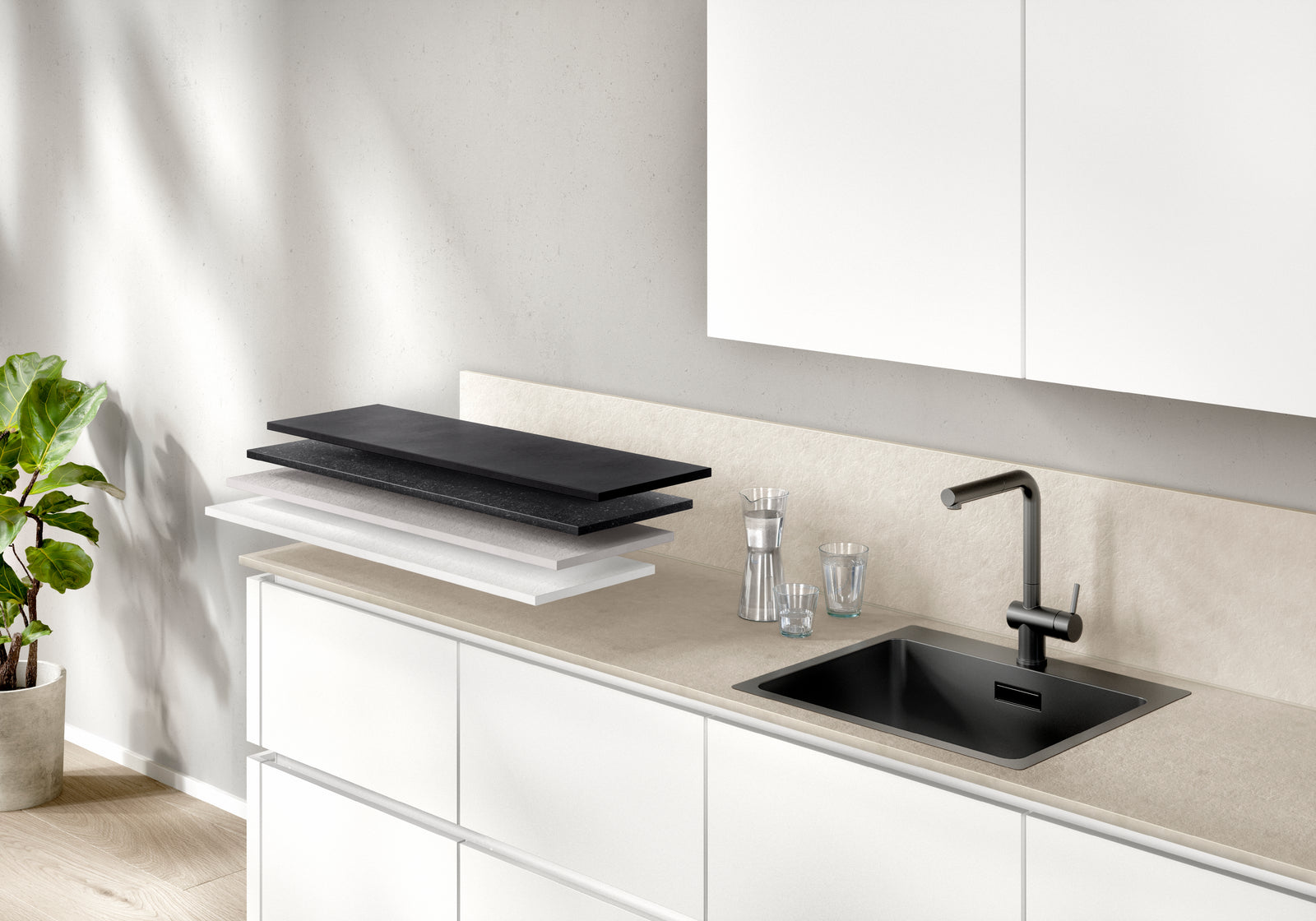 The patented Xtra Ceramic plate is manufactured using an innovative composite construction. The 16 mm thick worktop is made of 6 mm thick solid ceramic on a 10 mm lightweight carrier layer made of recycled glass. In combination with a shock-resistant design edge, Xtra Ceramic is ideal for extra demands in everyday kitchen life. Thanks to the scratch-resistant and aesthetic surface as well as the water resistance of the worktop, it is also suitable for use in the bathroom and gives your living area a natural look. Similar to the Xtra worktop, flush installation of technically approved hobs and built-in sinks is possible.