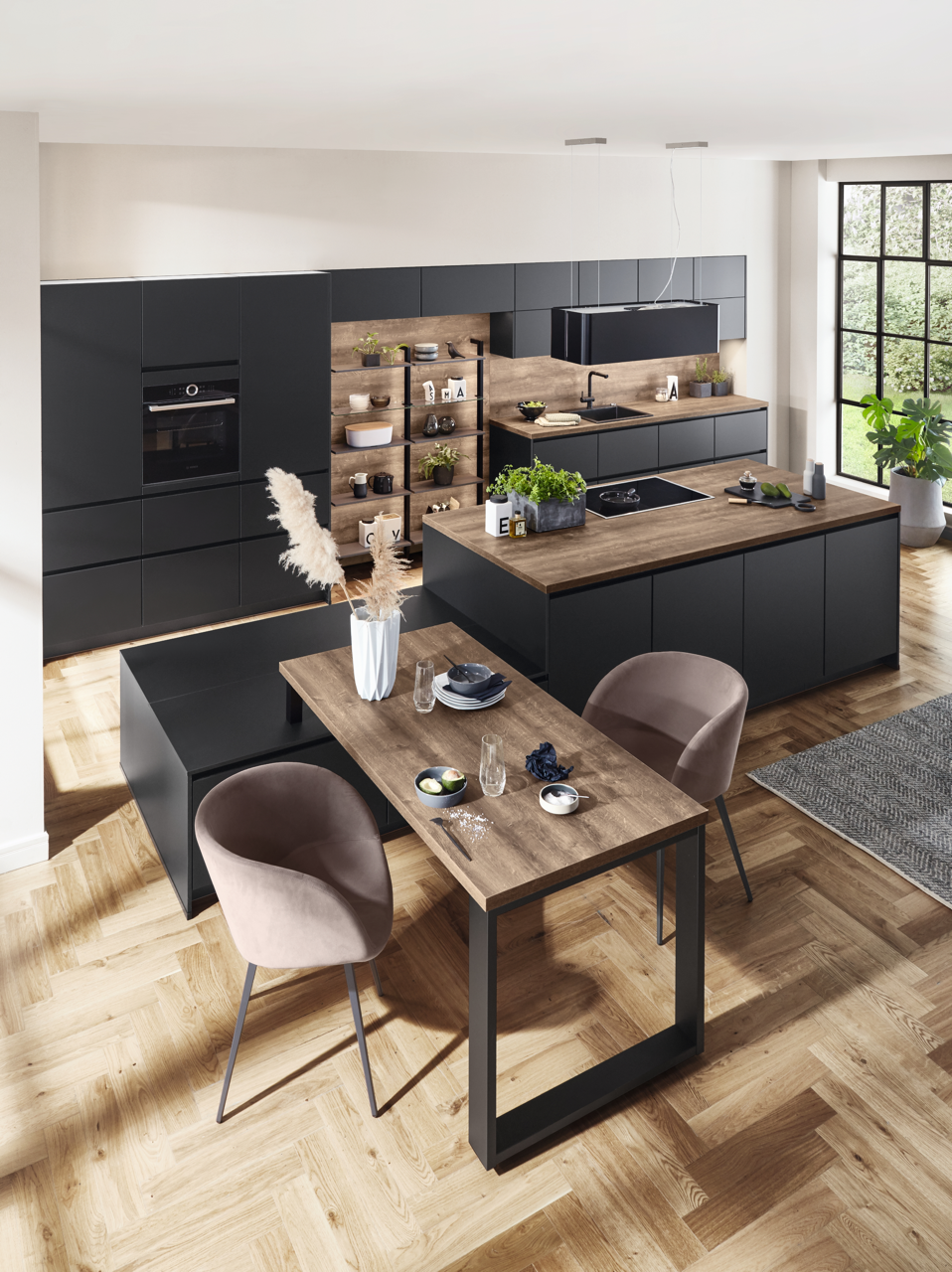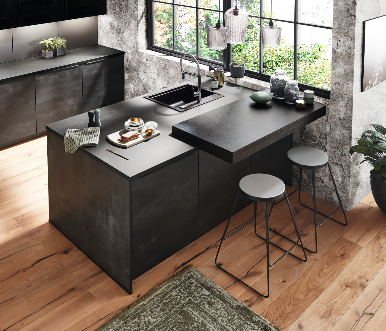 A chic counter solution can be integrated into the respective look of the kitchen as a dining and breakfast table in a particularly space-saving manner. Here you can celebrate never-ending breakfasts, set up buffets and welcome guests with an aperitif. And of course you can also use the counter to serve drinks in proper style.