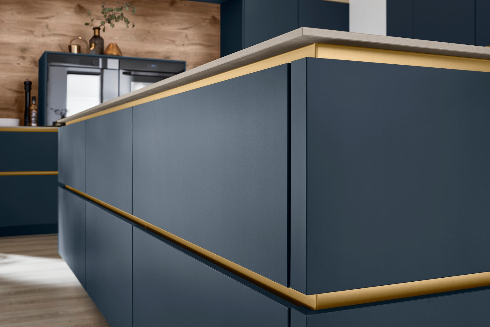 The APN worktop with N-edge has a rounded front edge, which is coated on the side with a straight decorative edge. An inserted N-edge is also available for an additional charge.