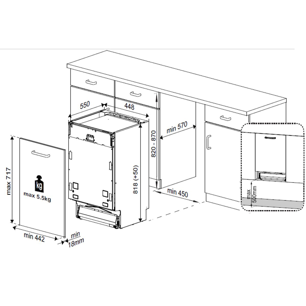 The inner container and floor of the dishwasher are made of stainless steel and offer height-adjustable cup racks, 2 foldable cup racks, a laterally movable cutlery basket, an instantaneous water heater, and the possibility of high installation. The dishwasher features a start time preselection of 3, 6, or 9 hours, a self-adjusting door spring, and rear plinth feet adjustable from the front. The niche height is 820-870 mm.