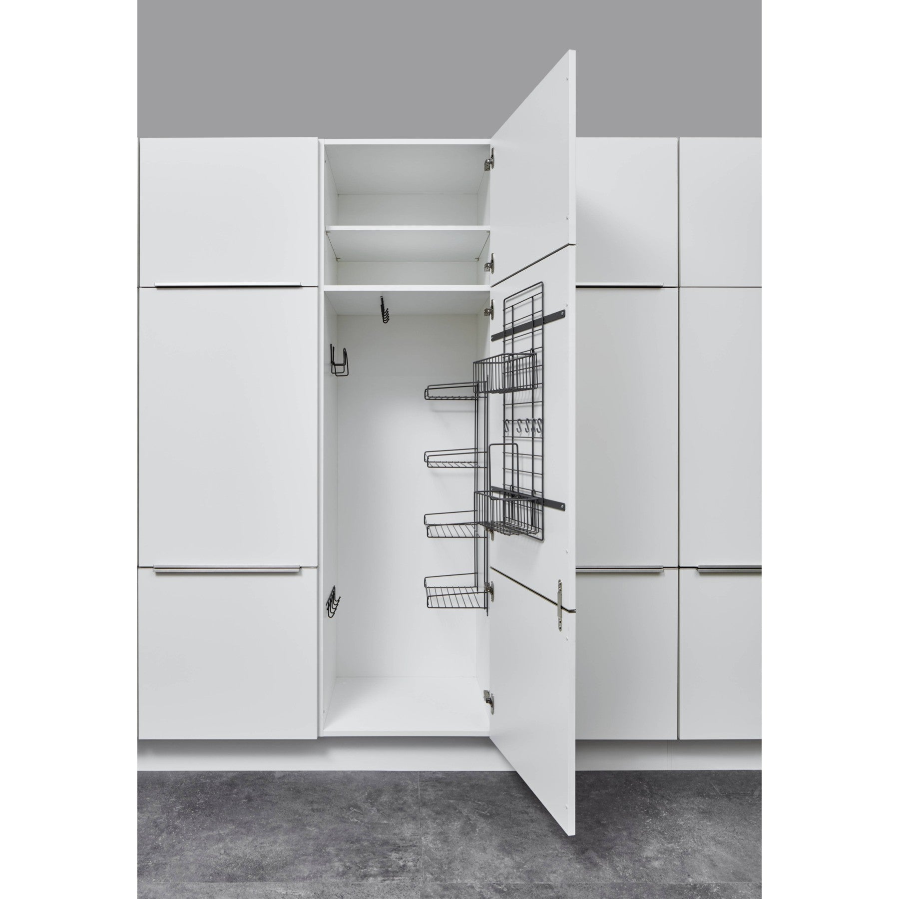 The nobilia broom/utility cabinet features a door with automatic cup hinges and soft-close function, ensuring a gentle closing of the door. Inside the cabinet, you will find a fixed bottom, a shelf, a system grid, two cleaning product baskets, a system shelf, a hose holder for the vacuum cleaner, and two hook rails. This thoughtful layout allows you to store your cleaning utensils neatly and have them ready at any time.