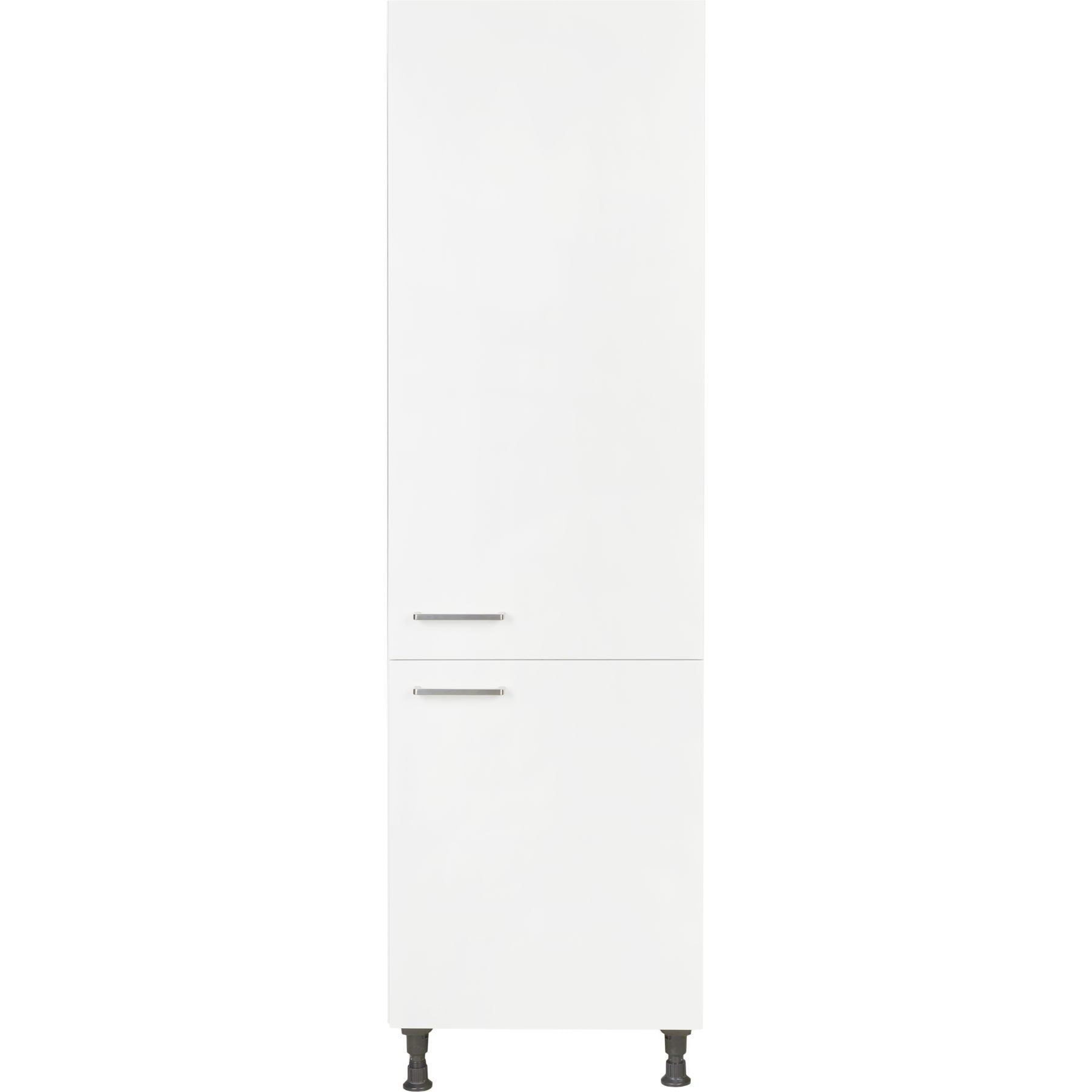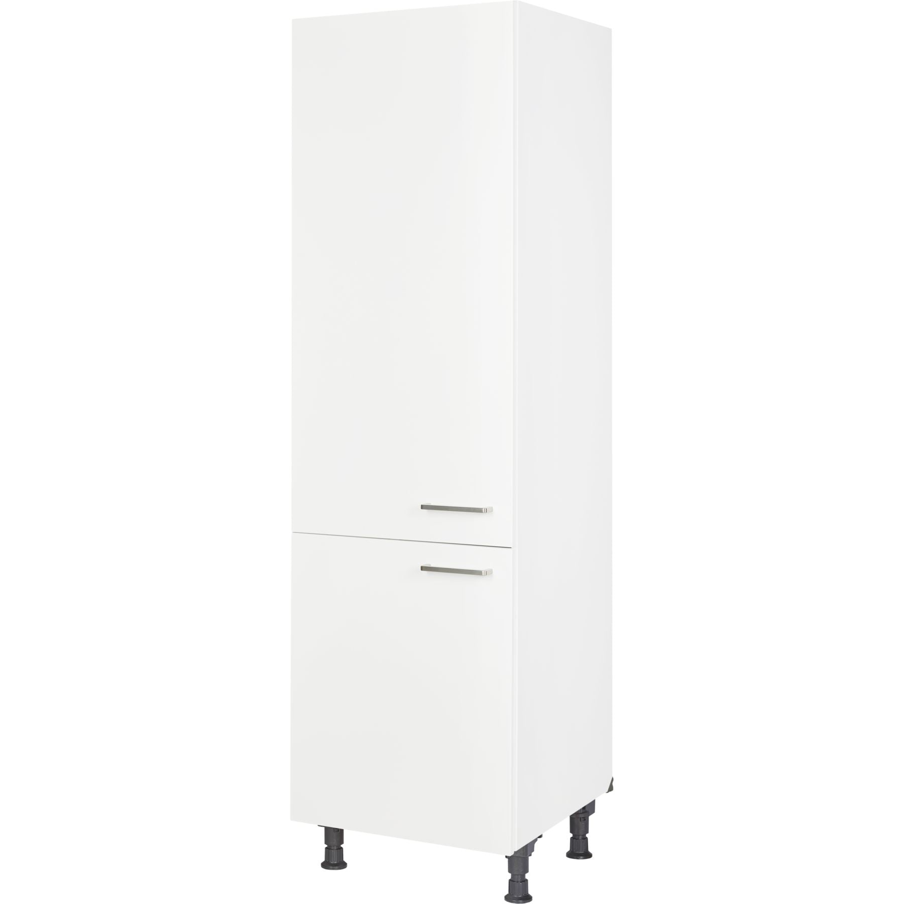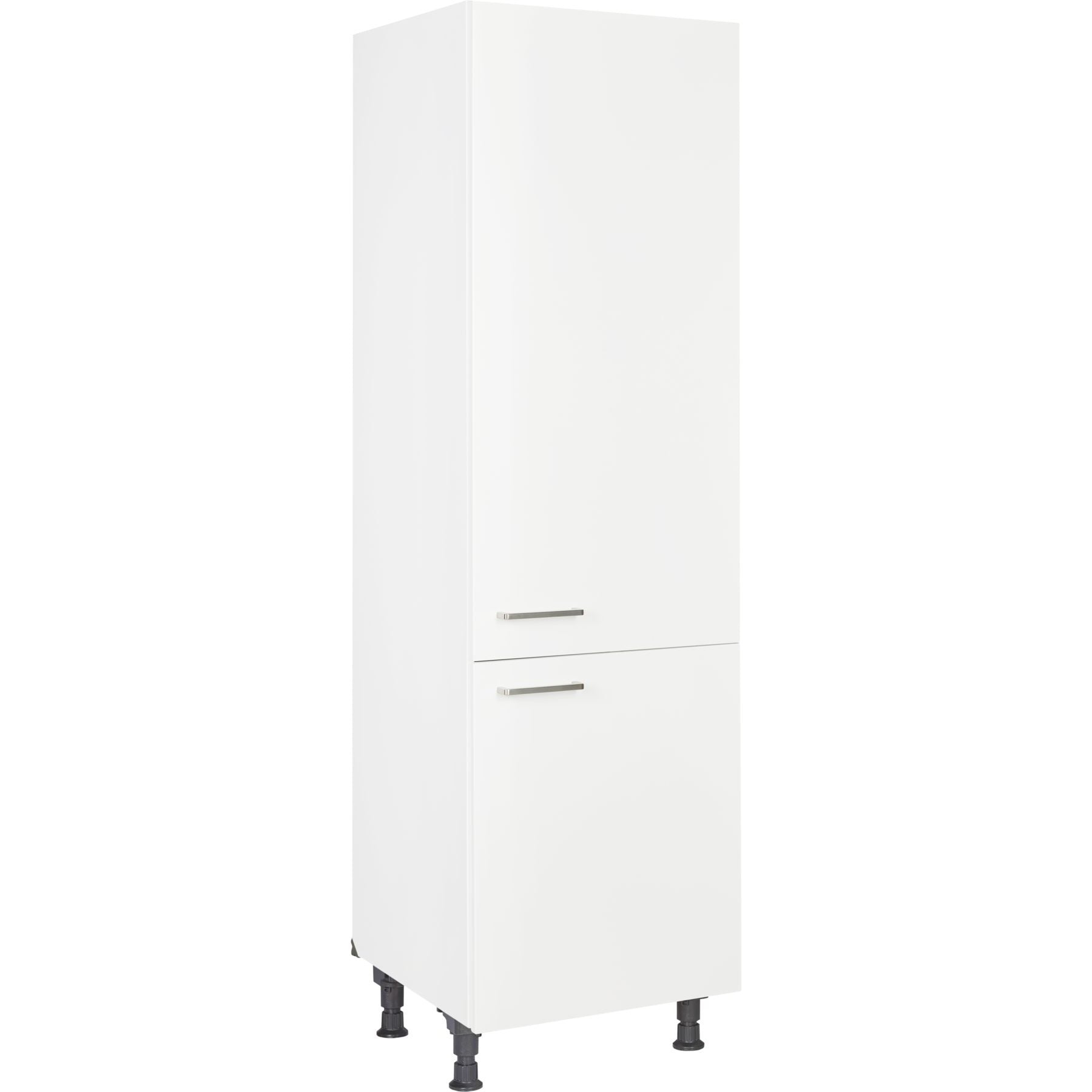 This modern nobilia kitchen appliance conversion cabinet from the nobilia Elements tall cabinet range is delivered with two doors for the installation of a fridge-freezer combination and a fixed shelf for a storage compartment. The white tall cabinet carcass is complemented by two high-quality door fronts in decor Touch 332 Alpine white super matte.