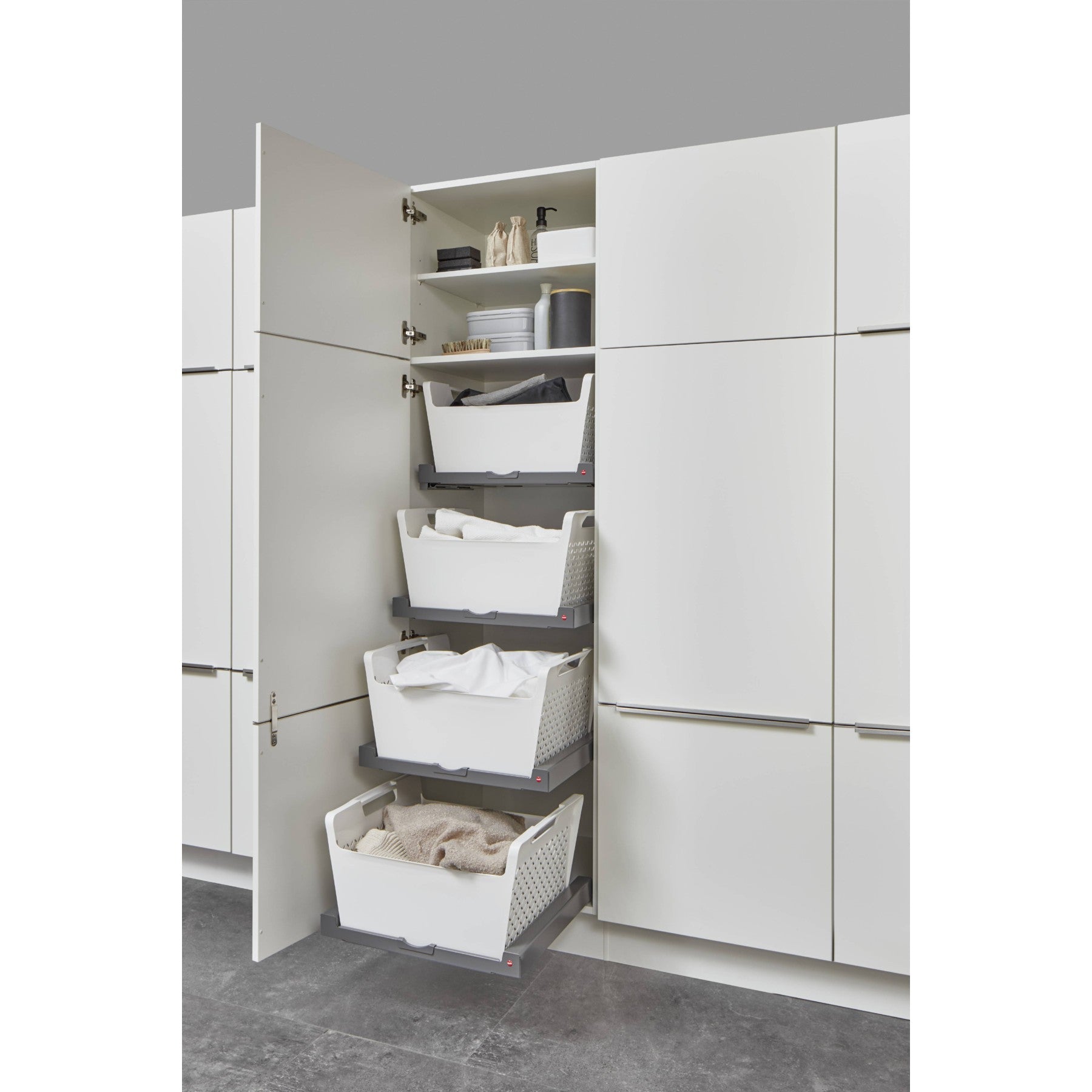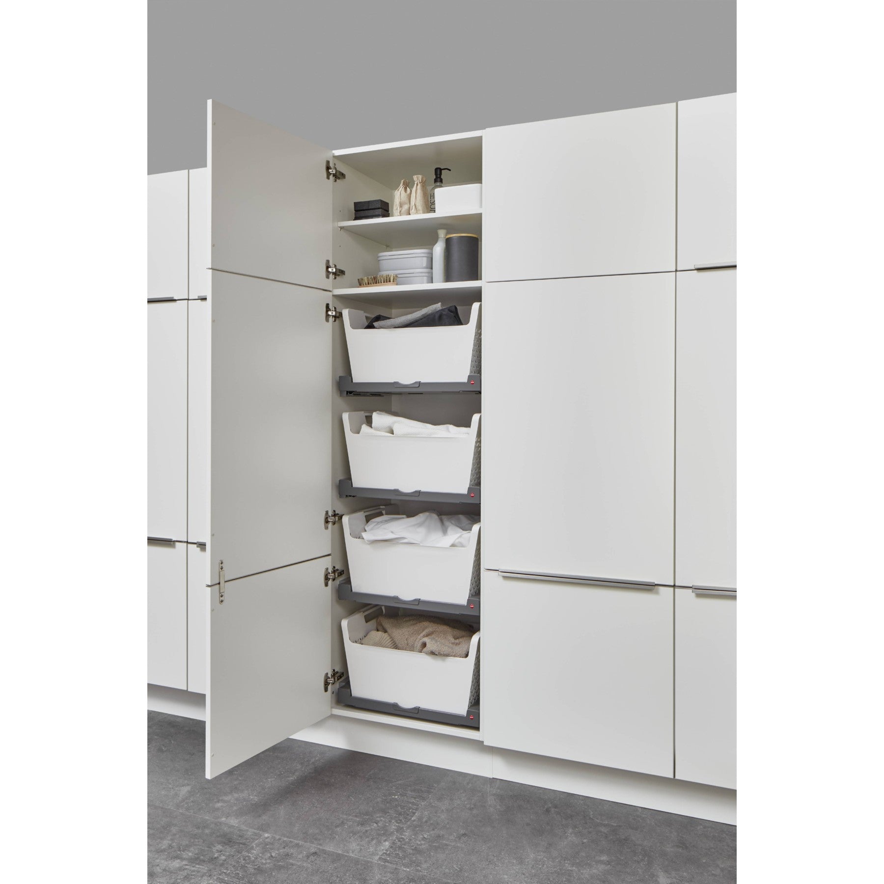 The automatic cup hinges with door damper and soft-close function ensure a gentle closing of the doors without annoying banging. The four shelf pull-outs allow easy organization of your kitchen utensils, while the four laundry baskets help you keep your laundry tidy.