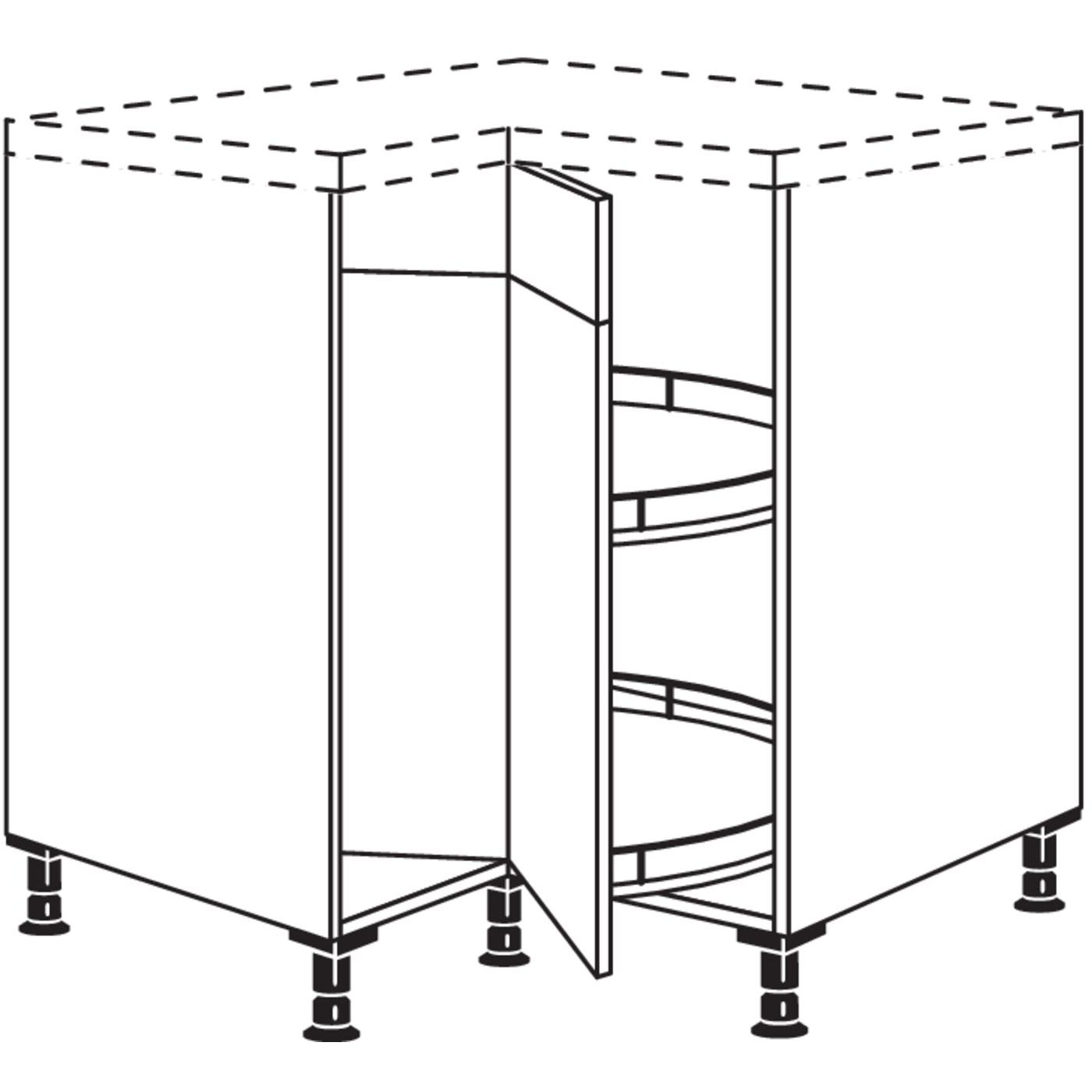 This unique corner cabinet features a dowelled door and offers sufficient storage space for your kitchen utensils with a corpus height of 894 mm. Inside lies the heart of the cabinet: a 360° rotating carousel with two wooden shelves, framed by a sturdy metal railing. The upper shelf is height-adjustable, allowing you to customize the interior space according to your needs.