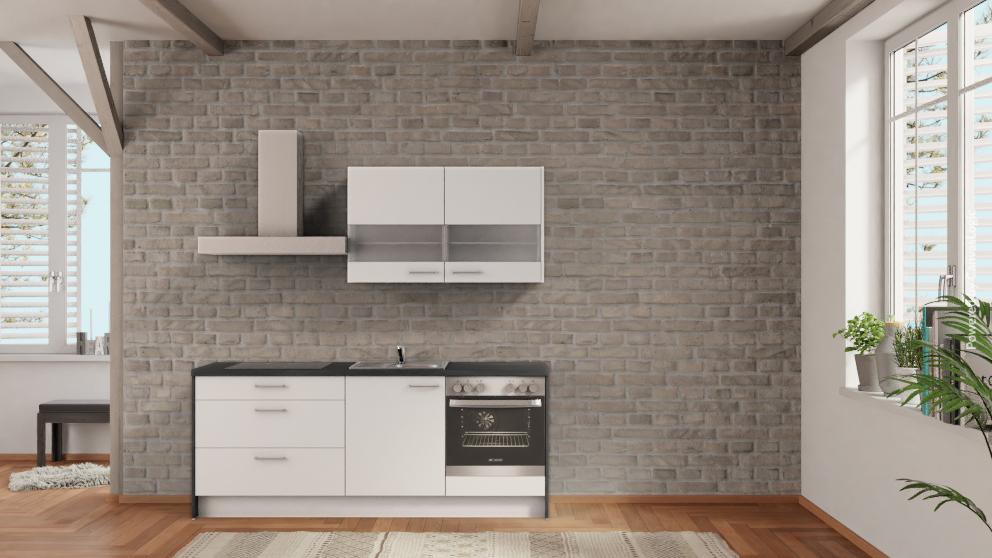 Comprar cocina nobilia Moers oferta económica desde fábrica | Configurador de cocina 3D | Mini cocina económica en blanco alpino de la gama nobilia Elements | 240 cm de ancho | 2,15 m de alto | 90 cm de espacio para, por ejemplo, una campana extractora | Cocina con horno empotrado Leonard | Placa de vitrocerámica independiente