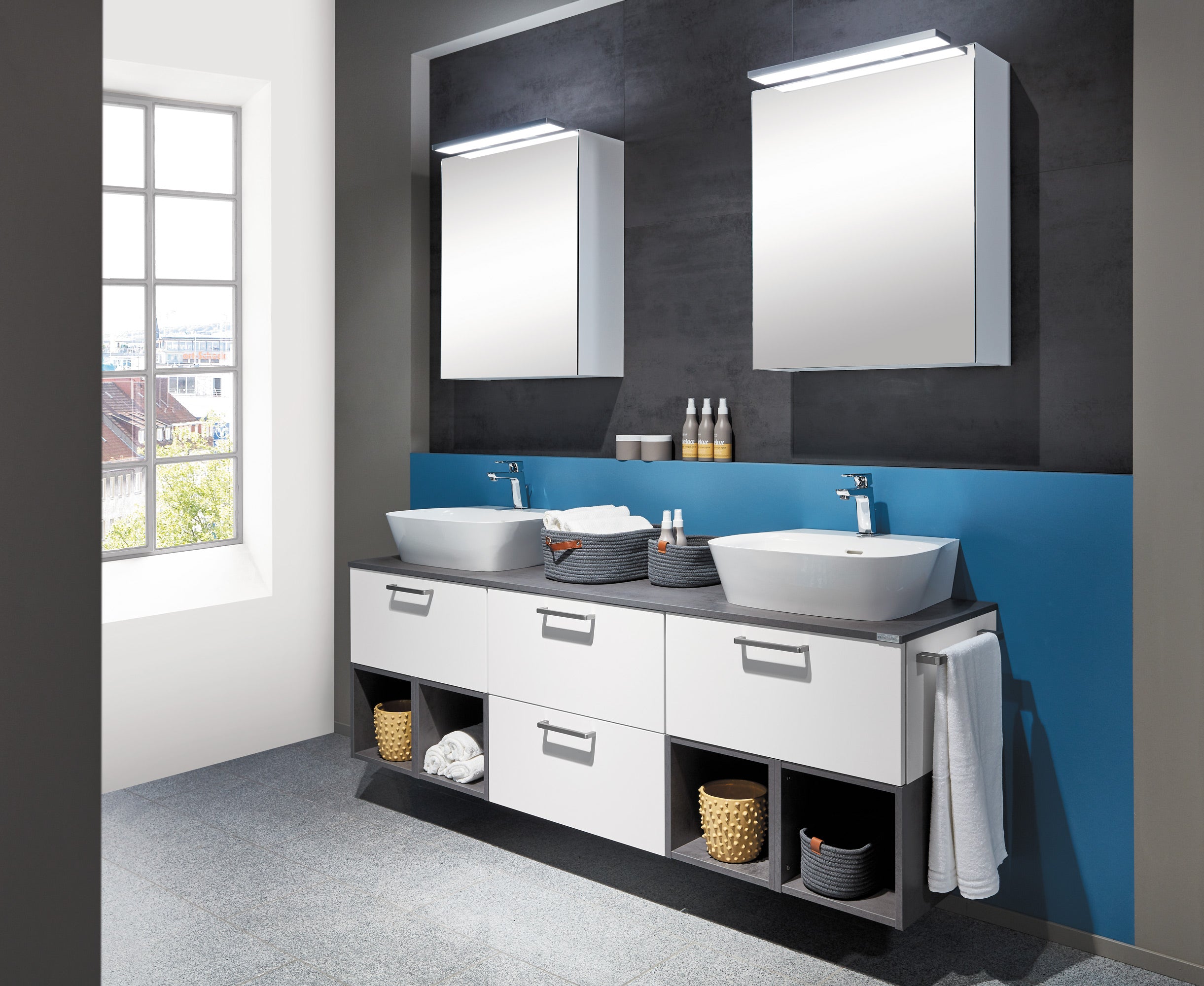 L'ensemble de meubles de salle de bain nobilia elements Bad Kissingen entièrement préassemblé a une longueur totale de 1,80 m | 180 cm et convient à la famille avec ses deux lavabos. L'ensemble de meubles comprend deux meubles sous-lavabo, un meuble bas, quatre étagères et en option une armoire miroir. Un fond de couverture ajusté est fourni avec les meubles bas. Le plateau de couverture résistant est disponible au choix dans le décor élégant 354 béton gris ardoise ou dans le décor chaud 198 chêne Sierra. L'accessoire approprié est livré avec les armoires nobilia elements. Cela comprend deux lavabos en résine minérale, deux robinets et deux siphons.