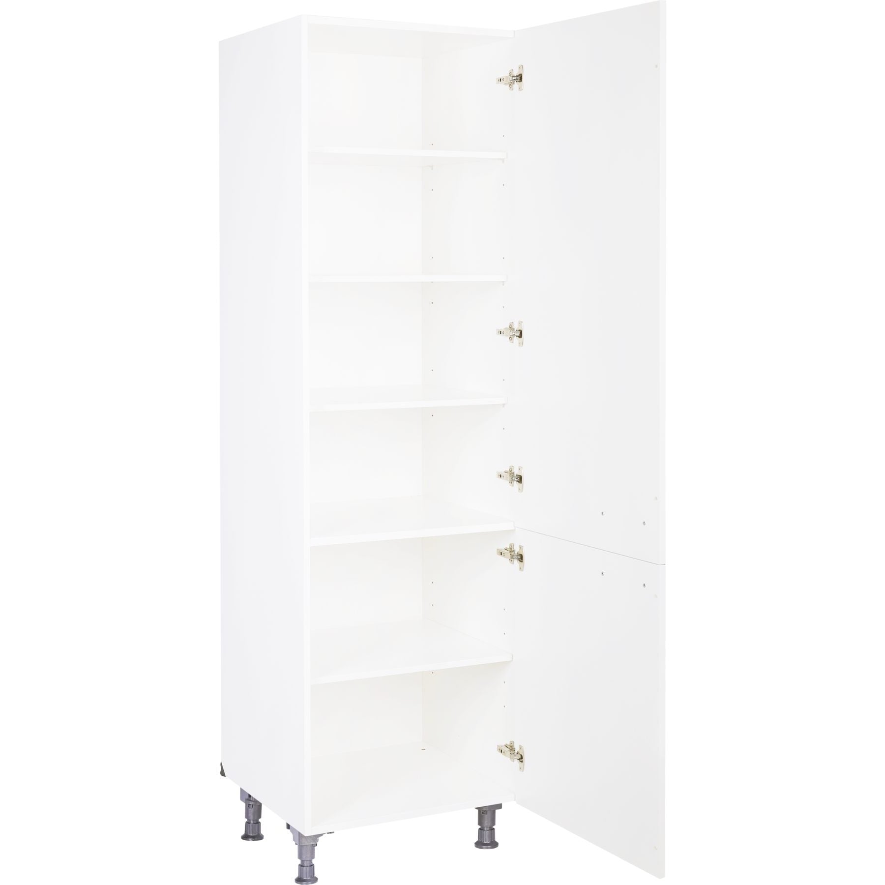 Cette armoire de rangement moderne nobilia elements Armoire de cuisine / Armoire haute de la gamme nobilia Elements Armoire haute est livrée avec deux portes, un fond fixe et quatre étagères. Le corps d'armoire haute blanc est complété par deux façades de porte de haute qualité dans le décor Touch 332 blanc alpin super mat.