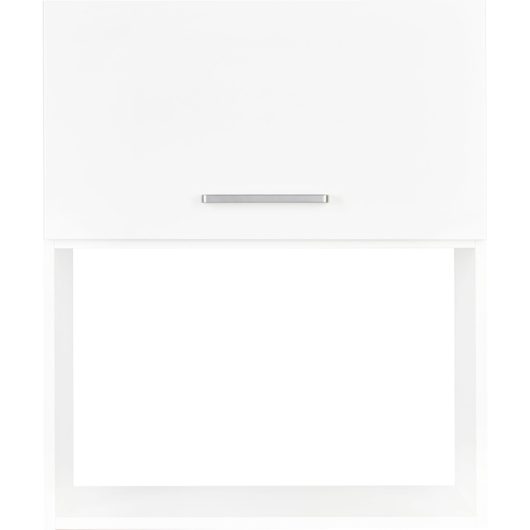 Le corps de l'armoire haute blanc est complété par une façade abattante de haute qualité en décor Touch 332 blanc alpin super mat. L'armoire murale est équipée d'une ferrure abattante de haute qualité Blum Aventos, qui ferme en douceur et silencieusement grâce à sa fonction SoftClose BLUMOTION.