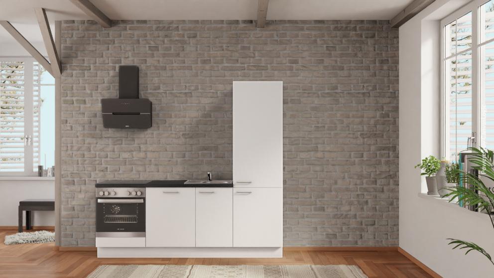 nobilia cuisine linéaire Grevenbroich offre sans lave-vaisselle | Configurateur de cuisine 3D | Mini-cuisine en blanc alpin à prix avantageux de la gamme nobilia Elements | 225 cm de large | 2,15 m de haut | 60 cm d'espace pour par ex. une hotte murale | Plaque vitrocéramique autonome | Mini-cuisine sans four