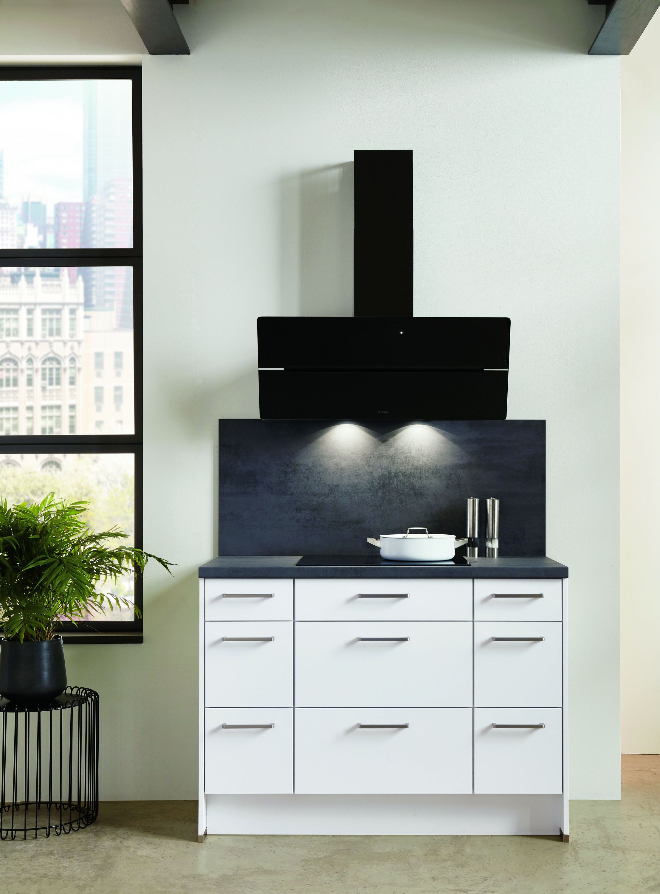cuisine 240 cm de large | nobilia Küchenzeile en blanc pas cher de la gamme nobilia Elements | 2,15 m de haut | Cuisine sans réfrigérateur | Cuisine sans four | petite cuisine sans lave-vaisselle | Cuisine avec plaque de cuisson et Elica 60 cm