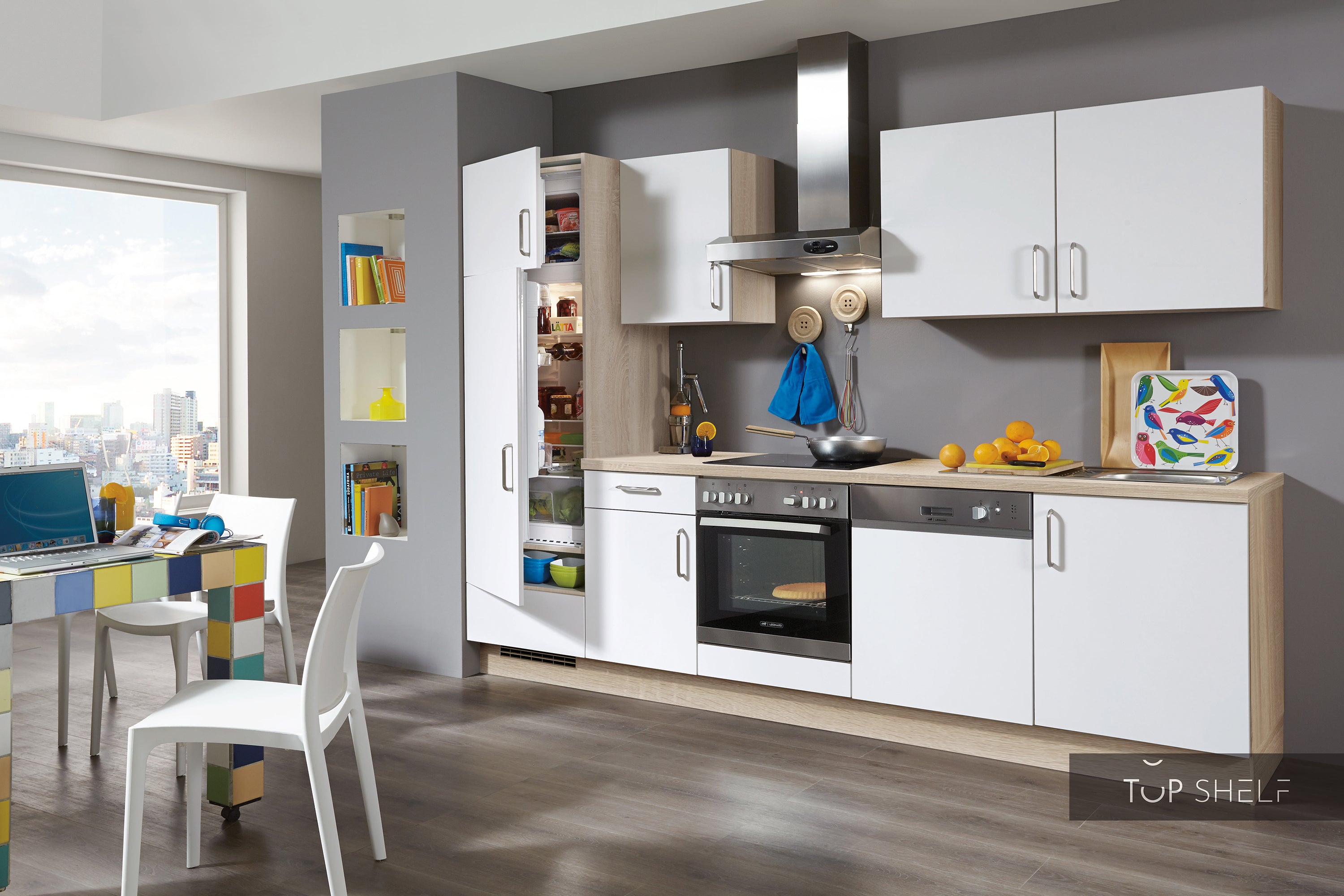 La cuisine nobilia entièrement prémontée se compose d'une ligne de cuisine d'une longueur totale de 3,00 m | 300 cm. La cuisine équipée comprend une armoire sous-évier, une armoire basse, un caisson pour four, un caisson pour appareil réfrigérant, deux armoires murales et une façade continue pour un lave-vaisselle partiellement intégré. Les armoires ont la décoration de façade 239 Blanc Softmat et les côtés & le socle sont dans la décoration 198 Chêne Sierra. Les appareils encastrables adaptés des fabricants renommés, tels que Junker, Leonard ou Elica, sont proposés directement avec les cuisines. Les appareils électriques et les accessoires peuvent être commandés en option ou la cuisine peut être commandée sans appareils électriques pour installer les vôtres.