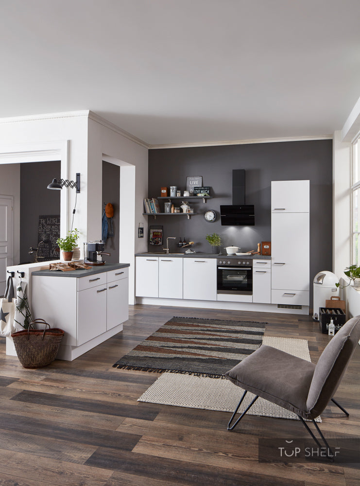 Les armoires nobilia Elements de la série nobilia Touch 332 se distinguent par leur design moderne et leur surface de qualité durable et robuste. Les façades blanches mates avec bords arrondis sont faciles à nettoyer et très faciles d'entretien. À l'intérieur, les armoires de cuisine sont équipées de ferrures de haute qualité de la société Hettich. Toutes les armoires nobilia sont fabriquées de manière durable en Allemagne et sont déjà montées, chevillées et collées dans l'usine nobilia. Avec les armoires préassemblées, le travail de montage de plusieurs jours est éliminé et vous obtenez des armoires de cuisine très stables et durables de première qualité nobilia "Made in Germany".