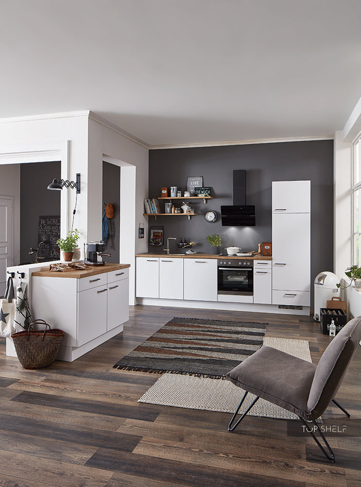 La cuisine encastrée nobilia elements Kiel entièrement préassemblée se compose de deux blocs de cuisine, larges respectivement de 3,00 m et 1,20 m. Les meubles bas de 1,20 m de large ont une hauteur de 0,91 m et le meuble haut dans le deuxième bloc a une hauteur de 2,15 m. La largeur totale des deux blocs est de 4,20 m | 420 cm. La ligne de cuisine comprend un meuble de transformation pour cuisinière, un meuble sous-évier, un meuble haut et un meuble bas de 30 cm de largeur. Pour le décor du plan de travail, vous pouvez choisir entre 198 Chêne Sierra et 354 Béton Ardoise Gris. De même, vous pouvez commander en option les appareils électroménagers et accessoires ou commander la cuisine sans appareils électroménagers et installer les vôtres. Les meubles de cuisine individuels peuvent être disposés de manière individuelle dans n'importe quel ordre et configuration. Les armoires placées séparément avec plan de travail offrent une surface de travail supplémentaire, permettant à plusieurs personnes de travailler dans la cuisine sans se gêner.