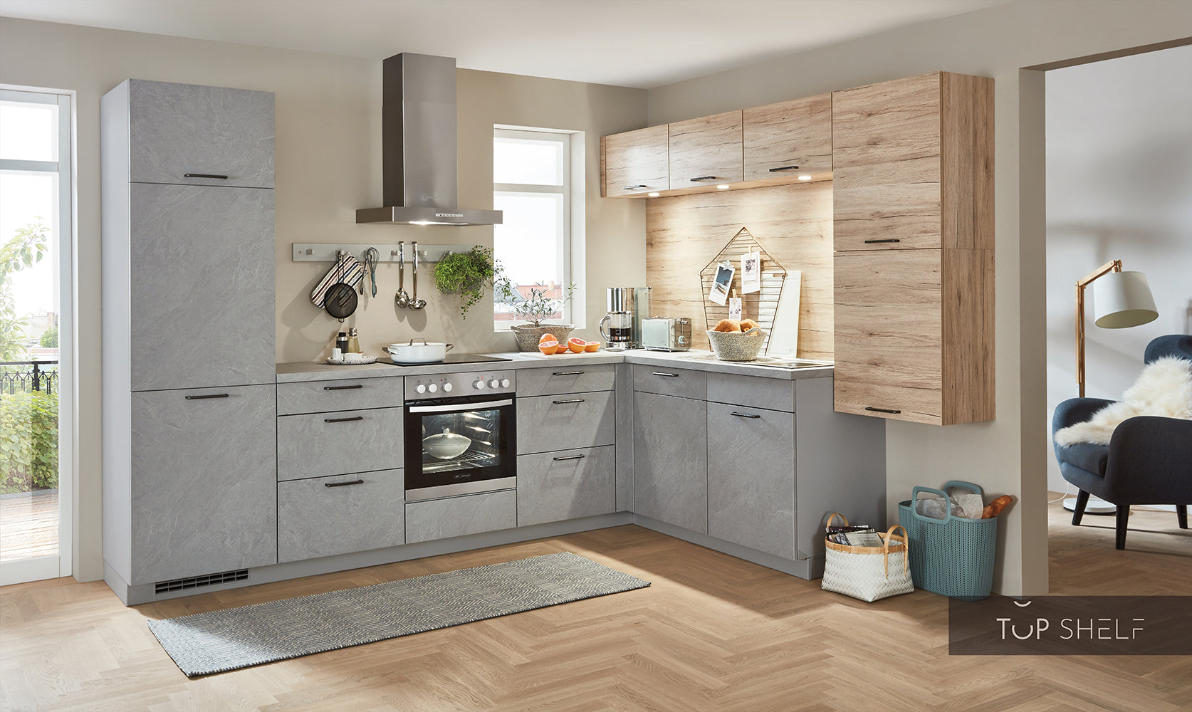 Cuisine d'angle nobilia StoneArt 304 ardoise imitation pierre grise 310 x 250 cm configurable sans appareils électriques
