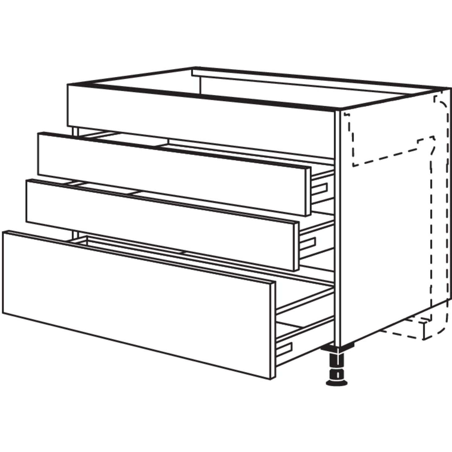 Ce meuble spécialement conçu s'intègre parfaitement dans tout environnement de cuisine et offre, grâce à son 1 panneau fixe, 2 tiroirs avec amortissement de haute qualité et fonction Soft-Close de Hettich ainsi qu'un tiroir avec extension totale et système Silent / Soft-Close, une utilisation optimale de l'espace. La spécification de l'appareil est obligatoire lors de la commande afin de garantir un ajustement parfait, car les profondeurs des tiroirs et des extensions sont adaptées individuellement à l'appareil utilisé et à l'espace libre prévu.
