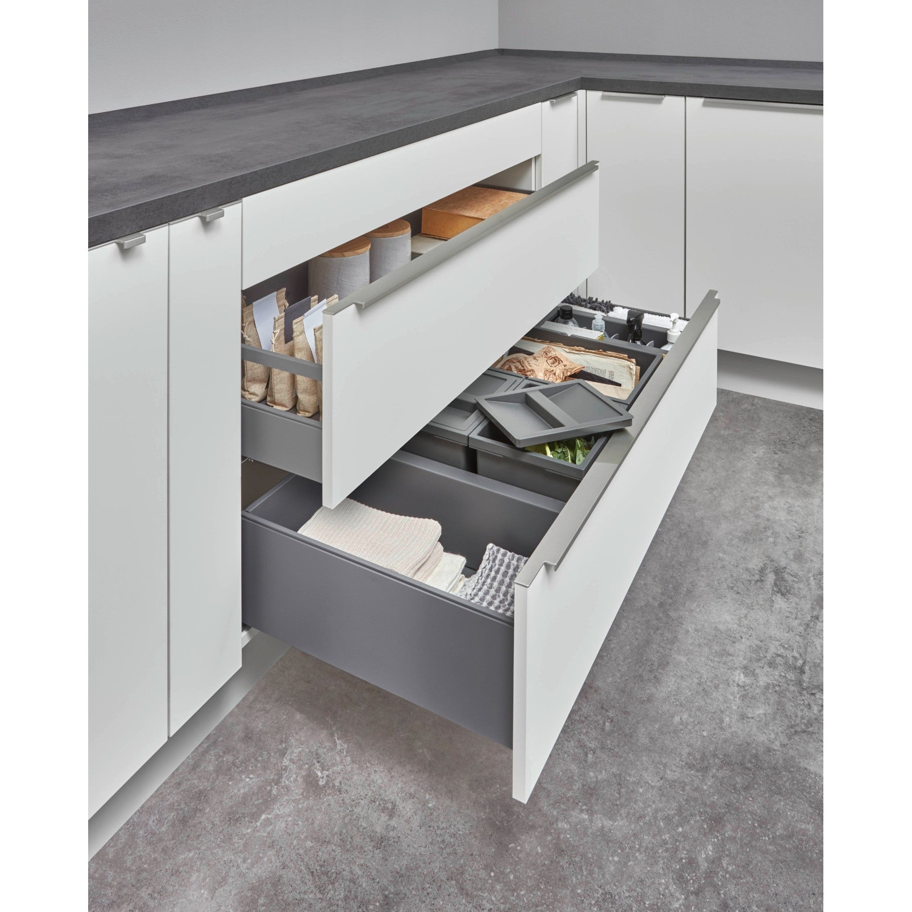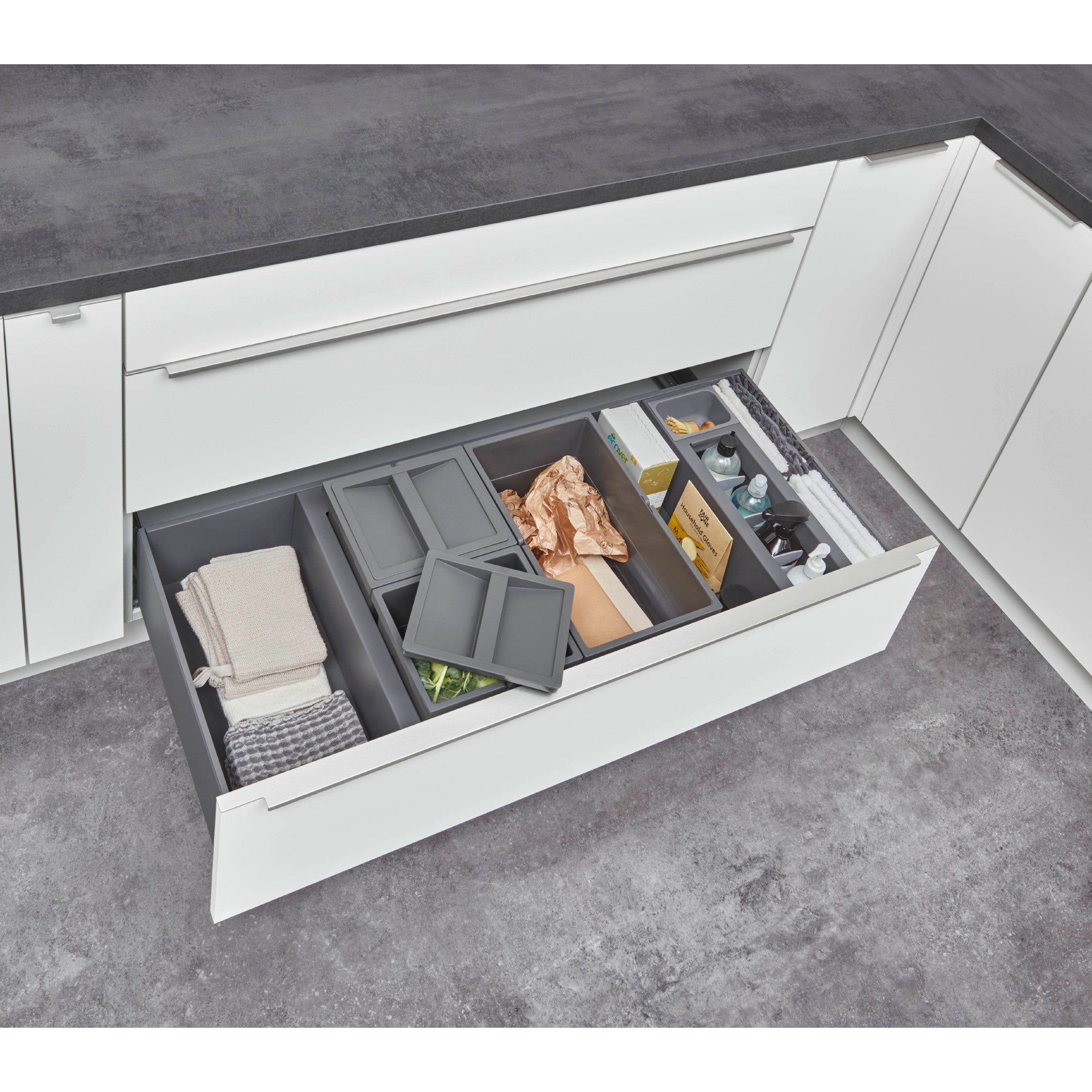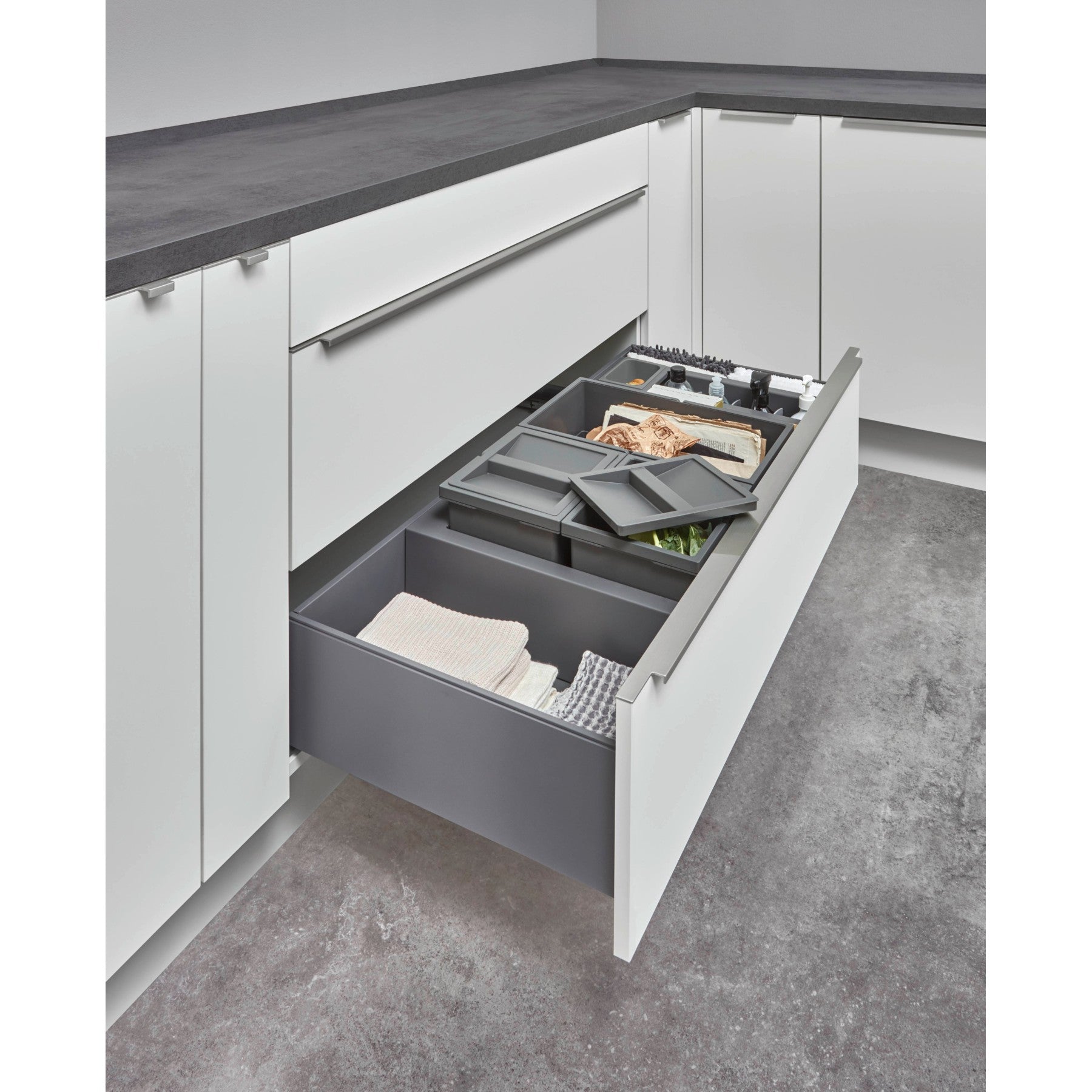 Un autre point fort est le tiroir de 500 mm de profondeur avec paroi arrière en métal et le système innovant de tri des déchets Separato. Ce système comprend 4 bacs de 14 litres, un élément d'organisation à l'arrière, un couvercle biodégradable, un ensemble balai-pelle ainsi que deux bacs à ustensiles, permettant un tri et une élimination efficaces des déchets. Le bac séparé de 4 litres, qui ne peut pas être utilisé dans le tiroir supérieur en combinaison avec une découpe pour siphon sur un meuble de 600 mm de large, complète ce design réfléchi.
