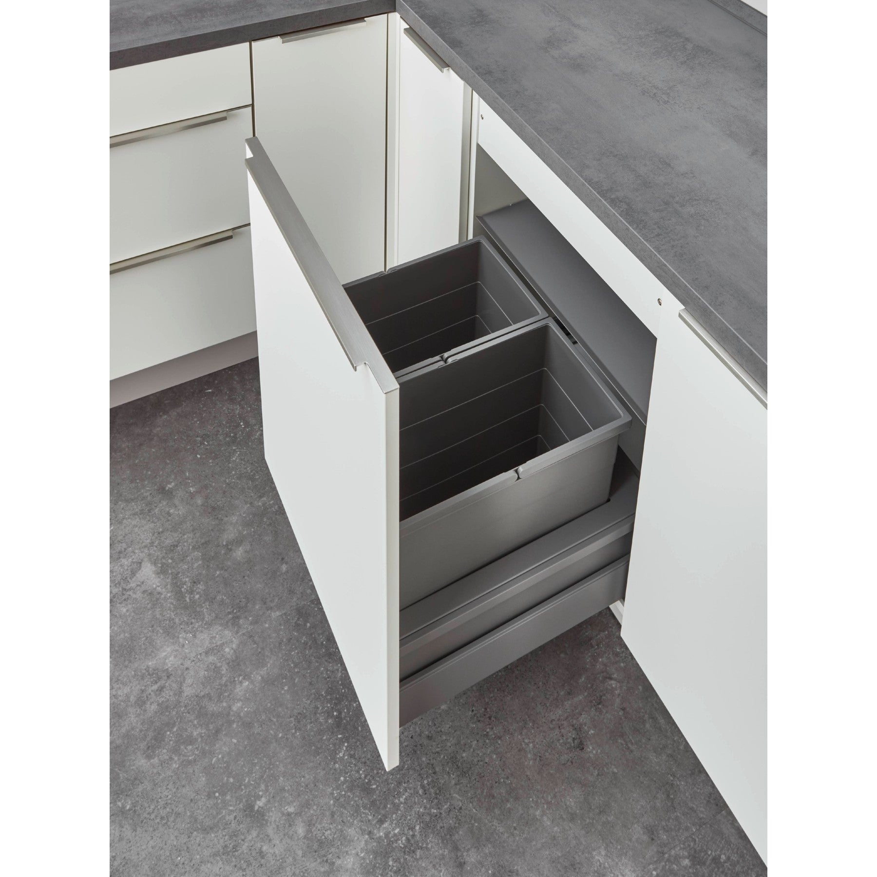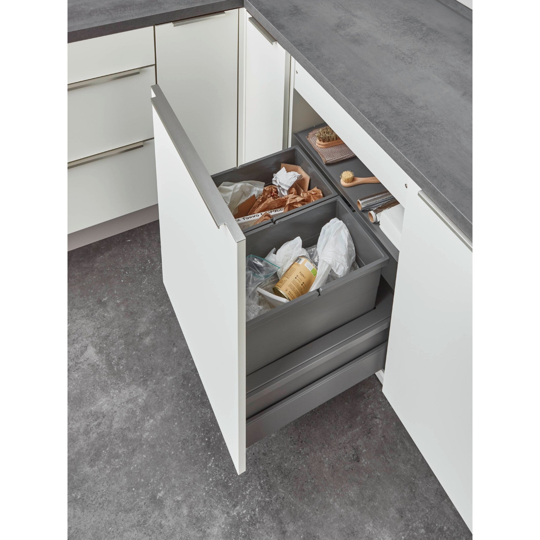 Un point fort particulier du Separato-M est le système intégré de tri des déchets. Avec deux seaux de 28 litres chacun, d'une hauteur de 350 mm, il permet un tri simple et efficace de vos déchets directement à la source. Cela favorise non seulement un mode de vie durable, mais rend également le travail en cuisine beaucoup plus confortable.
