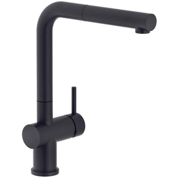 Deze fraai gevormde mengkraan in zwartmat is draaibaar. De kraan is uitgerust met een uittrekbare handdouche. Door de esthetiek van de kraan is hij een blikvanger in elke keuken, of het nu een elegante, sobere keuken is of een gezellige landelijke keuken. Door zijn functies is het gebruik van de kraan - ook in een keuken - een plezier.