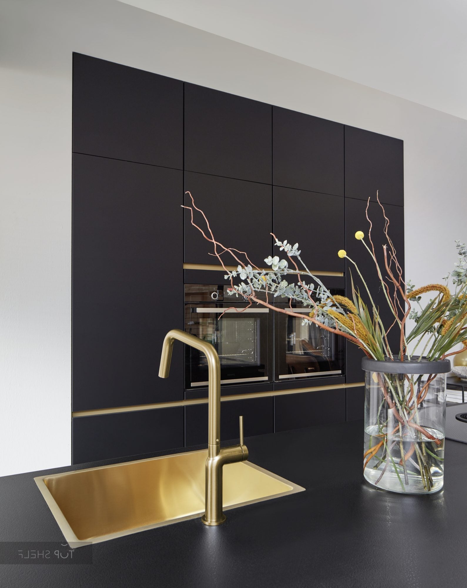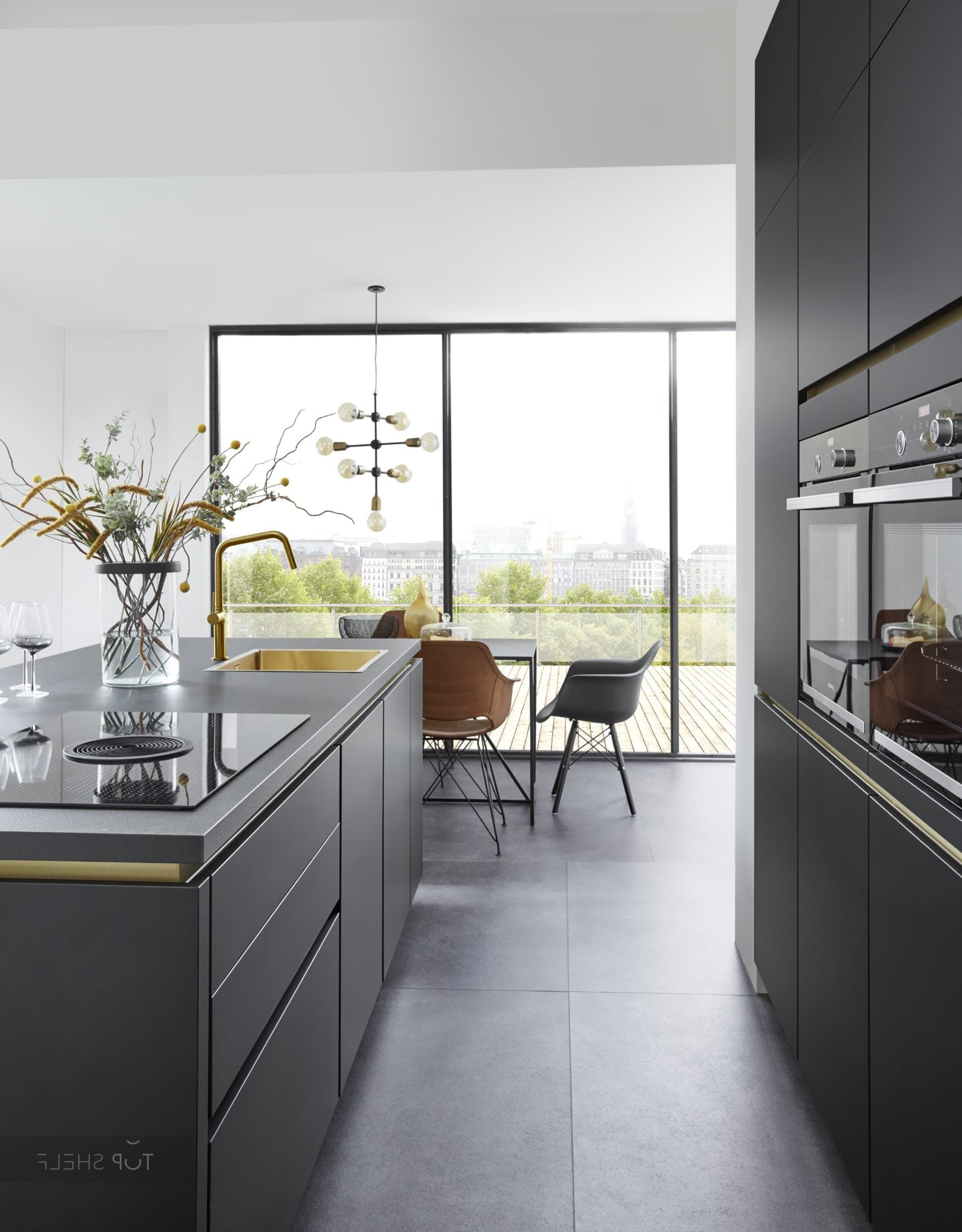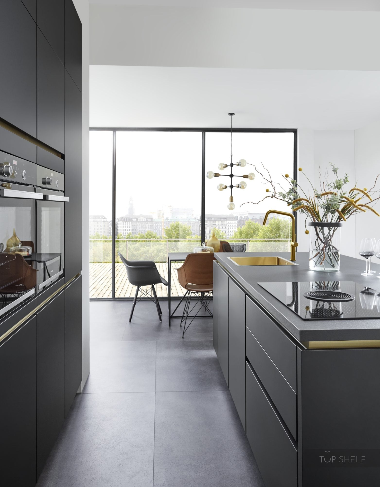 De volledig voorgemonteerde nobilia keuken is greeploos en bestaat uit een keukenrij breedte 240 cm en een kookeiland met een totale lengte van 250 cm x 110 cm. Deze keuken in industrieel design valt op door de rechte lijnen en zijn kleurcombinatie. De gouden greeplijsten en de spoelbak met bijpassende kraan zijn een bijzonder hoogtepunt en uniek kenmerk. De greeploze LINE N keuken bevat ombouw hoge kasten voor oven en koel-vriescombinatie, servies- en voorraadkast. De opzetkasten van de hoge kasten behoren niet tot de levering. Bij het eiland horen onderkasten in diverse breedtes, onderkast voor afzuigkap, vaatwasserfront en spoelonderkast. Het gehele eiland is omrand met een uniforme gouden lijst. Bij de keuken worden direct de passende inbouwapparaten van gerenommeerde fabrikanten geleverd, zoals hier van Bora en Junker (Junker produceert exclusief voor nobilia). De elektrische apparaten en accessoires kun je optioneel erbij bestellen of de keuken zonder elektrische apparaten bestellen en je eigen apparaten inbouwen.