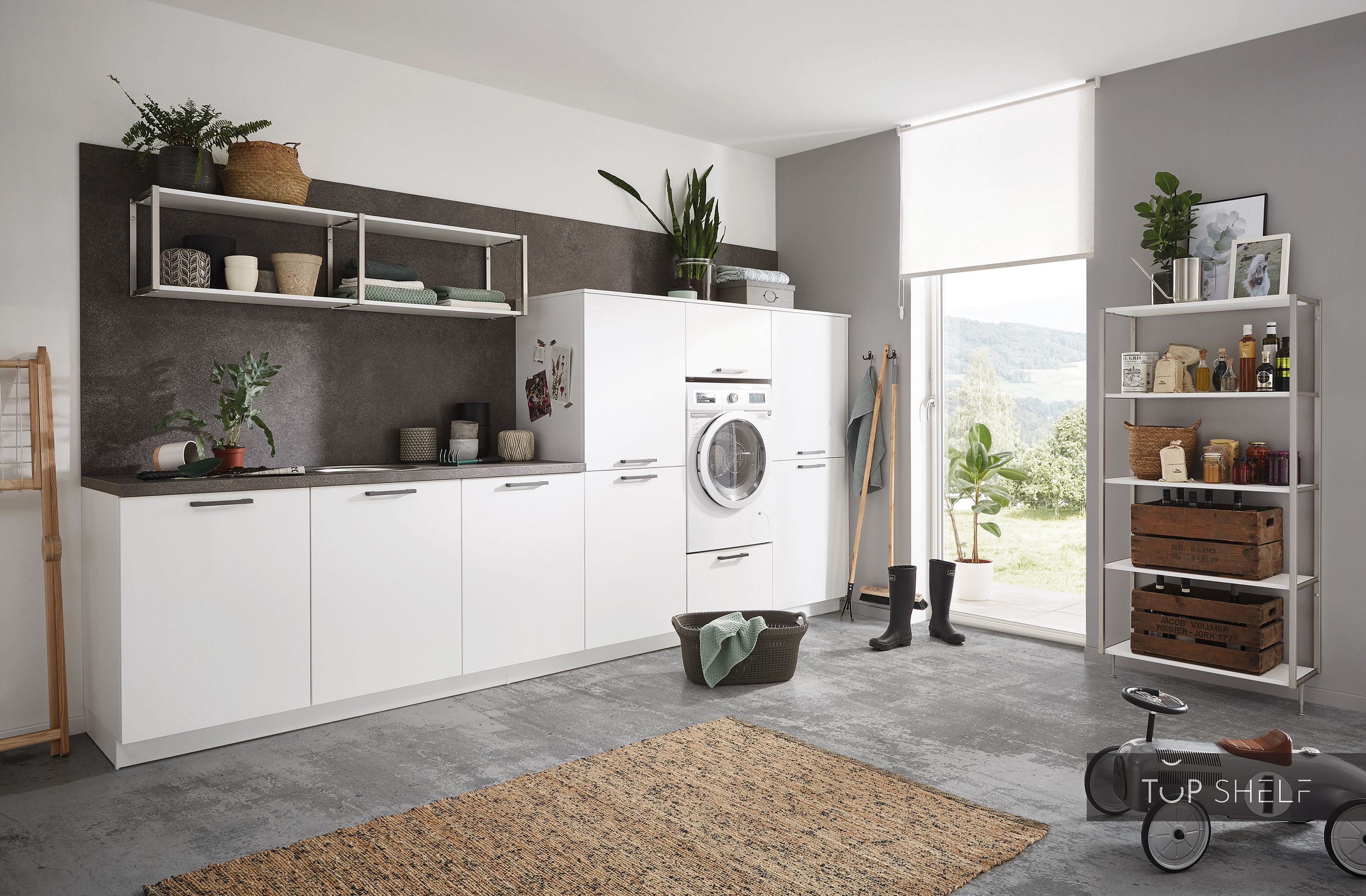 De volledig voorgemonteerde nobilia kasten voor de wasruimte bestaan uit een rij met een totale lengte van 3,60 m | 360 cm. De wasruimte bevat twee highboards, twee wandrekken, een apparaatombouw highboard voor de wasmachine en drie onderkasten.