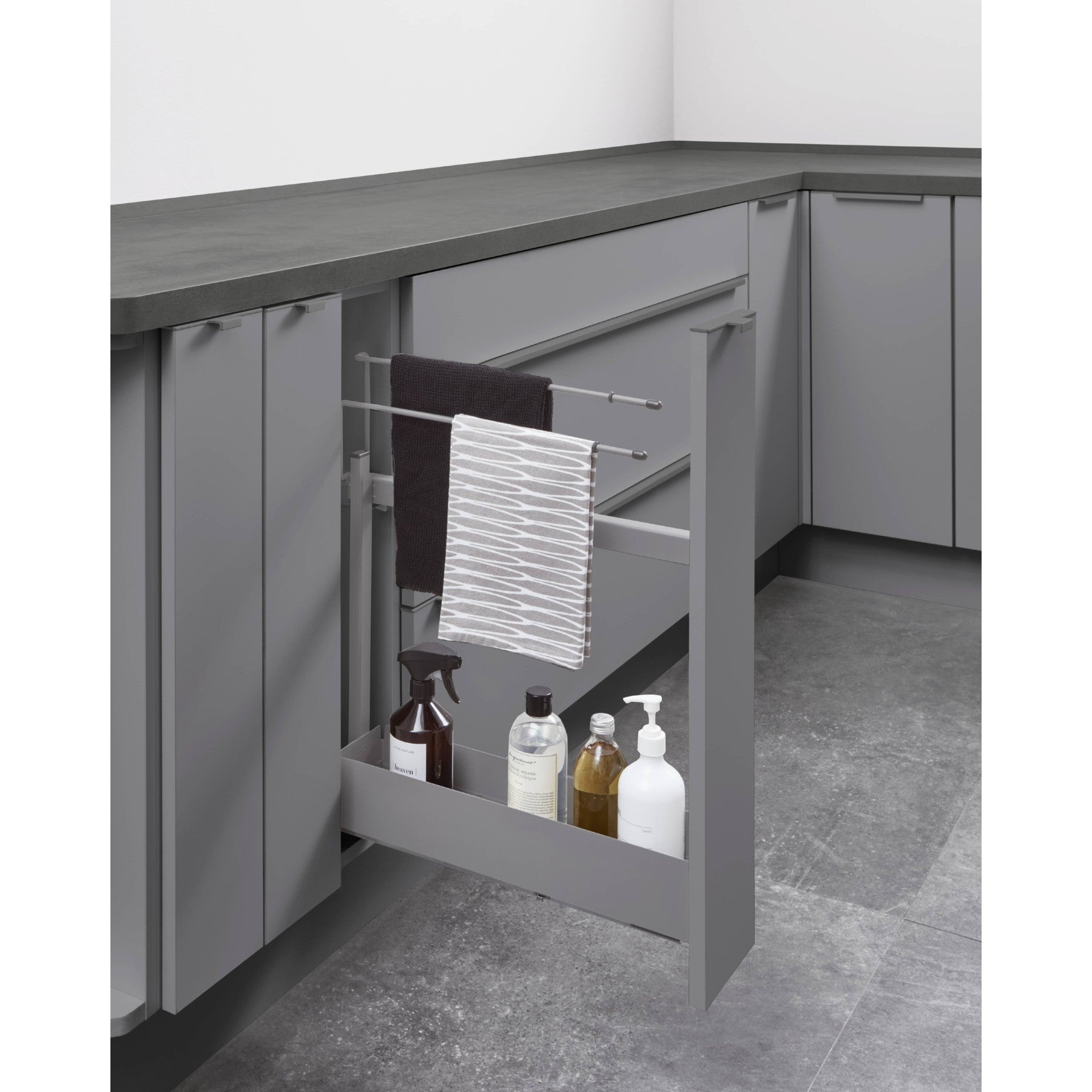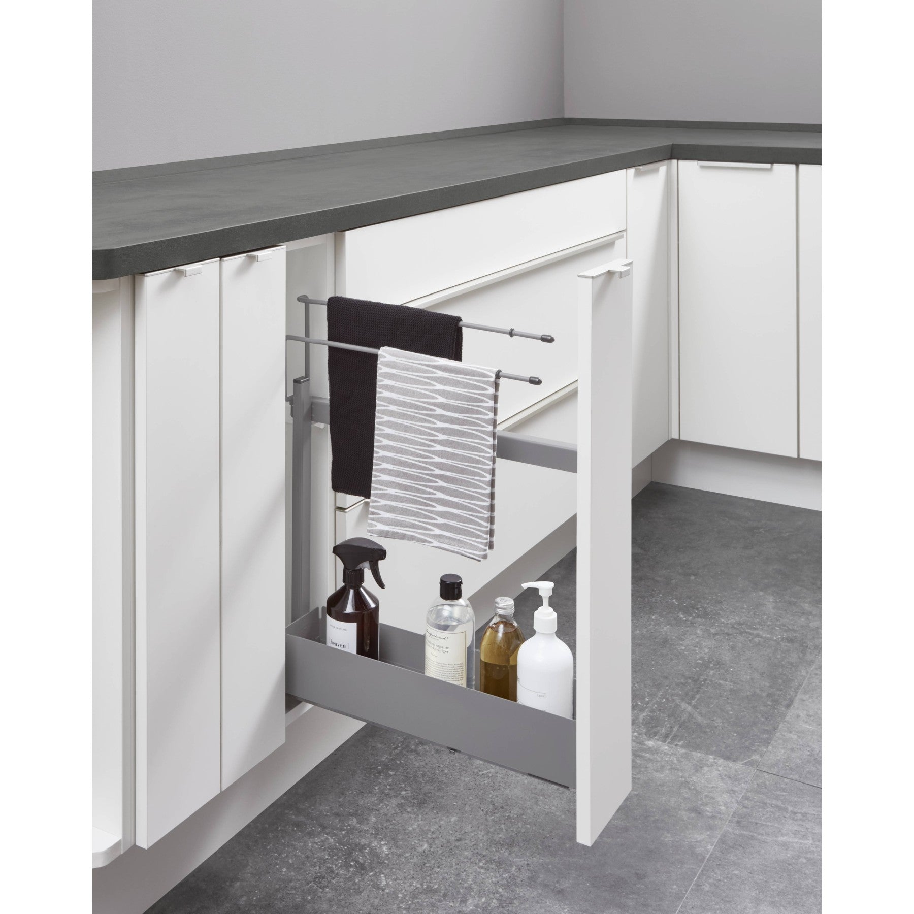 Deze uittrekbare kast onderscheidt zich door een hoogwaardige volle uittrek met in- en uitloopdemping van het Silent System / Soft-Close. Ervaar hoe zacht en stil de uittrek beweegt, wat het comfort in uw keuken aanzienlijk verhoogt. De doorlopende front geeft de kast een elegante en naadloze uitstraling, terwijl de 2-delige handdoekhouder voor extra functionaliteit zorgt. Vooral opvallend is de geleiding aan de rechterzijde, die een intuïtieve bediening mogelijk maakt. Bij frameprogramma's overtuigt deze kast met een gladde frontafwerking die harmonieus in elk keukendesign past.