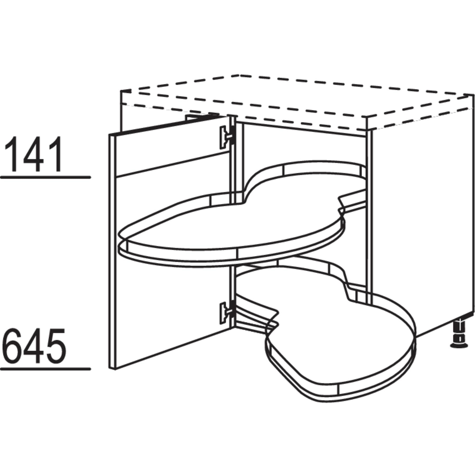 Dieser Eckschrank ist mit einer verstifteten Tür ausgestattet, hinter der sich zwei höhenverstellbare Holzschwenktablare verbergen. Diese sind mit einer eleganten Metallreling versehen, die für zusätzliche Sicherheit und Komfort sorgt. Das enthaltene Winkelpassstück ermöglicht eine nahtlose Integration in Ihre Küchenlandschaft. Mit Korpusbreiten von 900 mm und Planmaßen zwischen 650 - 750 x 1100 - 1200 mm passt dieser Schrank perfekt in jede Küche.